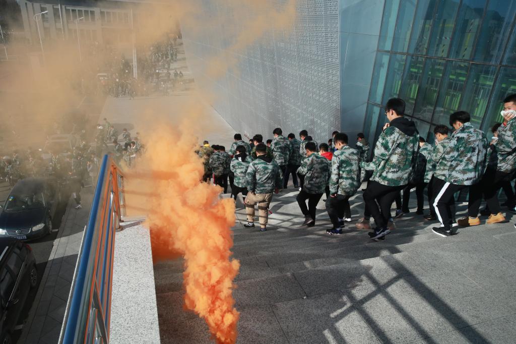 为进一步推进我院消防安全能力建设,提高师生的消防安全意识,真正掌握在火场中迅速逃生、疏散、自救的基本方法,提高抵御火灾和应对紧急突发事件的能力,2018年11月2日下午,学院举行首次6000余名全体在校学生参加的大学生活动中心消防疏散演练。学院副院长田雷、安全保卫处处长张磊、体育教学部主任王志东、各分院党总支书记、学办主任、分团委书记以及后勤管理处、学院团委、安全保卫处相关人员参加了演练活动,副院长田雷担任演练总指挥。