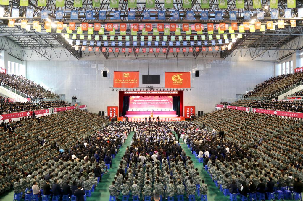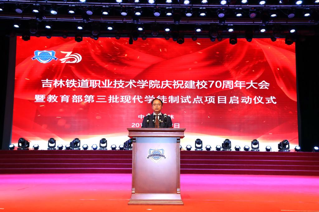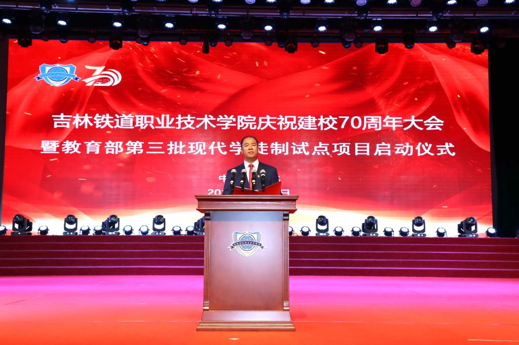 曹炳志院长回顾了学院七十年走过的光辉历程。他指出,承国运而生,与时代共进。吉铁院历经七十载岁月沧桑,从贡献我党接管南满铁路、中东铁路,取得辽沈战役、东北解放的胜利中驶来,到迈向中华民族全面复兴的伟大时代。犹如全速前进的列车,从“解放号”到“复兴号”跨越时代、风雨兼程,每一段铁轨都回响着“不忘初心,牢记使命”。七十年间立德树人,我们矢志不渝。七十年间广育英才,我们弦歌不辍。吉铁院在不同的发展时期,大气沉稳、玉汝于成,逐步形成了独具特色的精神内涵,并随着时代的脚步而拓新。一代又一代的吉铁院人,用自我的坚守传承着“明德弘业”的校训,培育出近七万优秀学子,他们在这里腾蛟起凤,他们的建设足迹随着铁路沿线踏遍神州大江南北,进而走出国门、誉满海内外,用一个又一个鲜活的出彩人生,讲述着吉铁院的奋斗故事。他表示,吉铁院的历史就是一部奋斗的历史,拼搏的历史,更是一部发展的历史,尤其自2006年改建高职学院以来,学院抢抓机遇,凝心聚力,实干担当,争先进位,冲刺梦想,抓住五大机遇,实现五大发展,用九年的历程完成了其他高职院校二十年的发展。