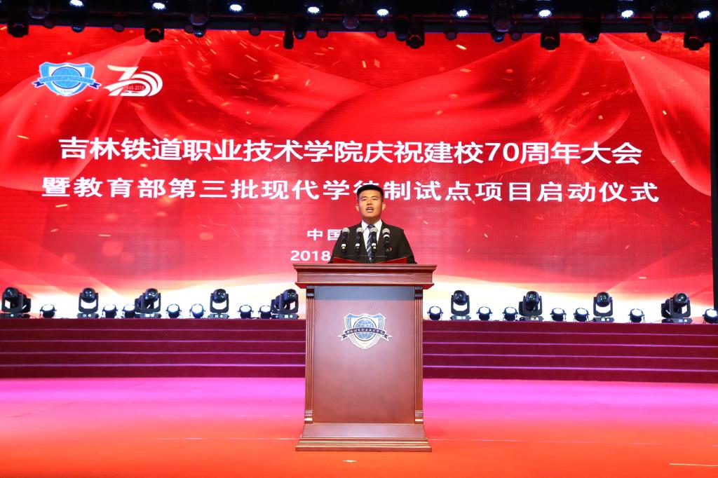 曹炳志院长在致辞中,代表学院、代表全院师生向莅临大会的各位领导、海内外嘉宾、回家的广大校友,表示热烈的欢迎;向对母校赤子情深的7万海内外校友表示亲切的问候;向长期以来关心支持学院发展的各级政府、各级领导、各界朋友,向为学院事业做出重要贡献的中国铁路总公司、沈阳路局集团公司等行业企业,向老一辈职业教育工作者、离退休老领导、老同志,以及在新时代奋发有为、风鹤正举,奋力推动学院新一轮振兴发展的全体吉铁院人,致以崇高的敬意和衷心的感谢。