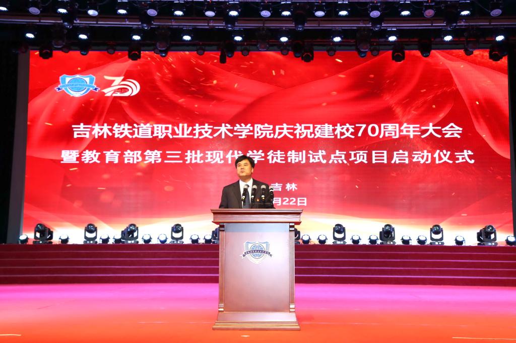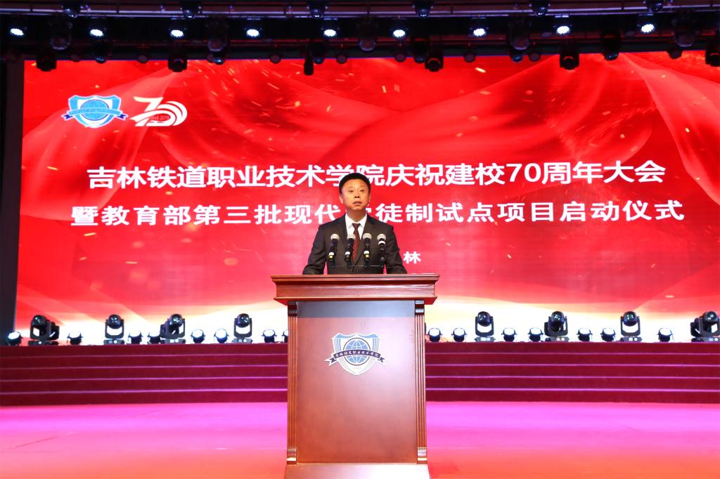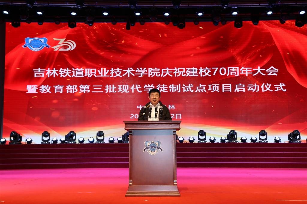 最后,举行教育部第三批现代学徒制试点项目启动仪式。吉林省人大常委会副主任车秀兰、吉林省教育厅副厅长战高峰、中国铁路沈阳局集团有限公司总工程师骆武伟、吉林市委常委 常务副市长李天林、吉林市人大常委会副主任刘吉全、吉林市政协副主席李敏花、吉林铁道职业技术学院院长曹炳志,共同按下现代学徒制试点项目启动按钮。现代学徒制是国家倡导的一项旨在深化产教融合、校企合作,进一步完善校企合作育人机制的一种新的人才培养模式。教育部从2014年开始实施现代学徒制试点单位遴选,吉铁院经过几年的努力,今年有幸成为教育部第三批现代学徒制试点单位。这对培养高水平高素质技术技能型人才、满足社会发展需要,促进学院的发展意义重大。相信伴随着教育部第三批现代学徒制试点项目的启动,吉铁院必将在新时代继续奋力前进、守正出新,将70年积淀的文化传统、工匠精神发扬光大。