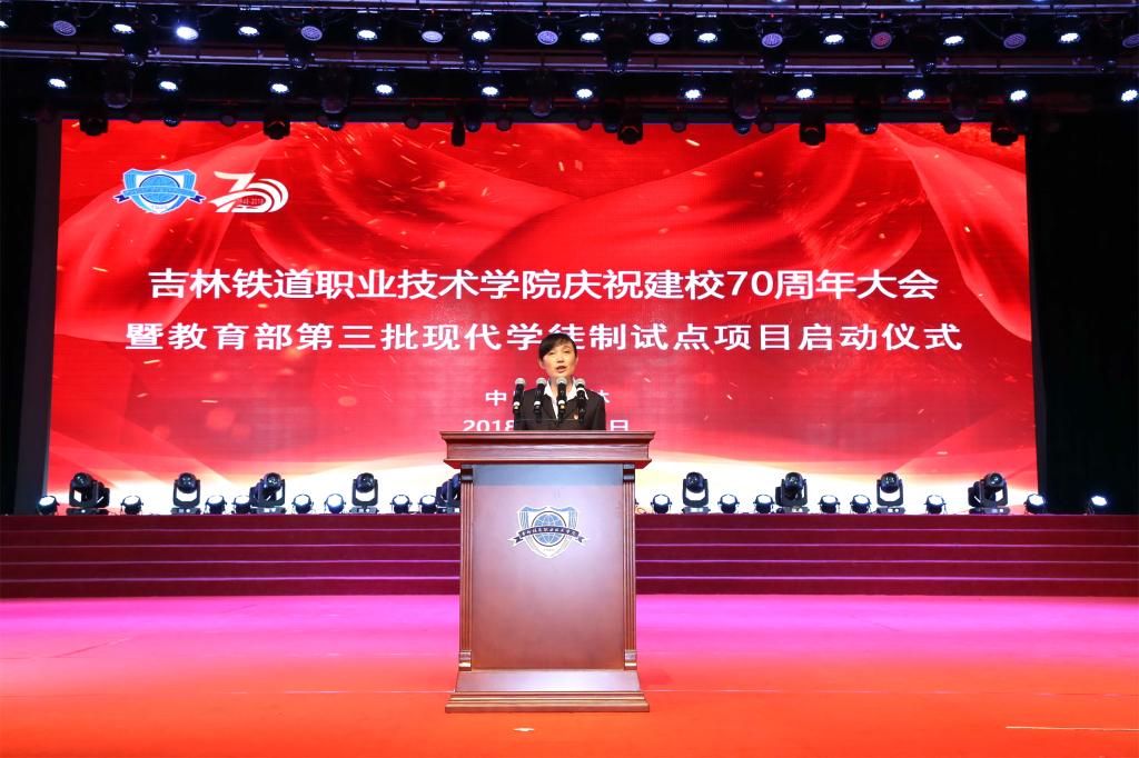庆祝大会在庄严的国歌声中拉开帷幕,与会人员共同观看了学院建校70周年校庆专题片《七秩薪传 筑梦百年》,大连交通大学副校长关天民、白城师范学院党委书记王喜库分别致辞,校友代表郭德飞、教师代表张辉、在校生代表李志强先后发言,院长曹炳志致辞,最后进行了教育部第三批现代学徒制试点项目启动仪式。