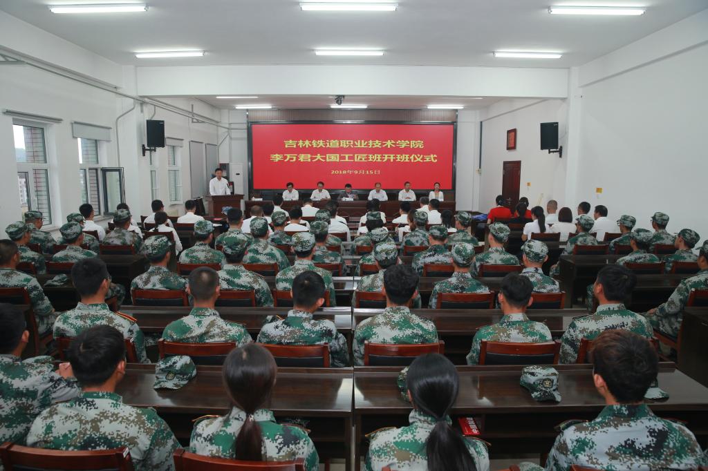 仪式上,副院长李欣宣读了《关于成立“李万君大国工匠班”与建设“李万君大师工作室”的决定》。学院党委副书记、院长曹炳志致辞中,首先对李万君教授表达了衷心的感谢,同时,对大国工匠班学生提出希望他们学习工匠精神、希望他们能够深入实践苦练技能。最后,对机械工程分院提出要求,要在李万君教授的亲自组织指导下,发挥好李万君大国工匠工作室的作用,制订好大国工匠班的人才培养方案,在课程建设、教材开发、教学团队建设、实训室建设、校企合作、科研项目攻关等各个方面都有突破。力争将大国工匠班打造成少年工匠成长、成才基地,将焊接专业建设成为具有吉铁院特色的品牌专业,最终成为当地离不开、业内都认同、国际可交流的特色高水平专业。李万君教授在讲话中,向大家介绍了焊接人才的社会需求情况,介绍了“工匠精神”的社会氛围,同时也对大国工匠班学生提出争当工匠的期望和要求。拜师仪式上,学生代表向李万君教授敬献了鲜花;班主任组织学生向其行拜师礼,并宣读誓词;李万君教授为学生代表佩戴“李万君大国工匠班”班徽。