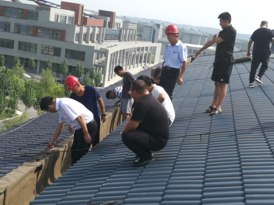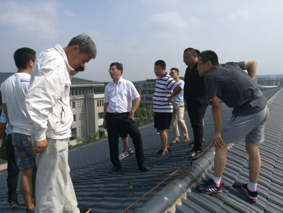 检查中,一行人员来到3号实训楼屋顶。田雷副院长对屋面防护措施、檐口瓦的铺装工艺、防水卷材铺装方案进行检查,并提出天沟立面卷材上返屋面部分应用钢带打牢,下返檐口部分应用燕尾自攻钉固定,以免风载过大,引起卷材脱落;外墙墙面砖空鼓处要一并处理好,将安全隐患降至最低。随后,检查组一行来到博物馆标段现场,田雷副院长对该标段的安全文明施工,成品保护,工期提出要求。他强调,在保证质量的前提下,要确保工期,务必在合同要求工期内完工,以保证新学期开学及70周年校庆正常开馆。在火车头文化广场施工现场上,田雷副院长对关键工序提出具体要求,他指出,火车头的除锈、涂装必须要保证质量,确保效果。