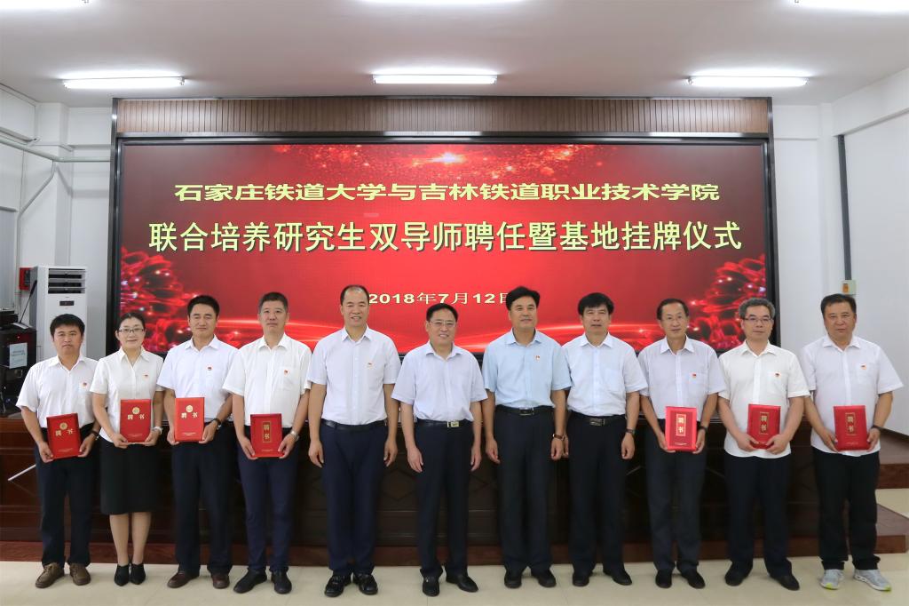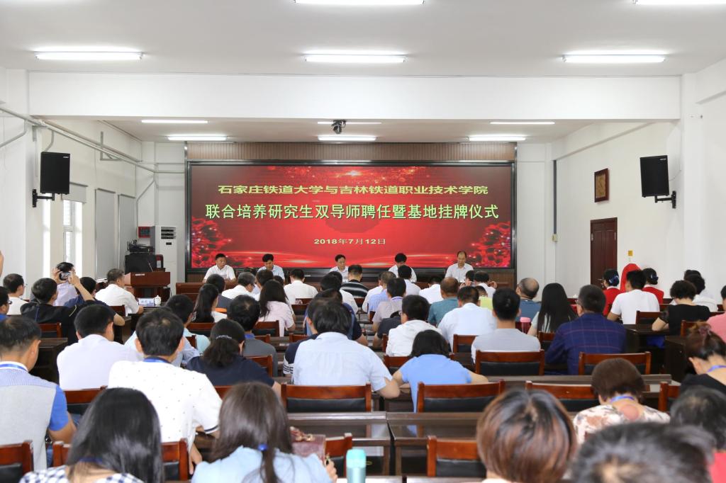 2018年7月12日,石家庄铁道大学与吉林铁道职业技术学院联合培养研究生双导师聘任暨基地挂牌仪式在我院办公楼五楼第三会议室举行。石家庄铁道大学党委书记王岳森教授、副校长陈进杰教授、机械工程学院院长潘存治、电气与电子工程学院书记鲍怀义、交通运输学院书记杨春燕、土木工程学院副院长孟丽军、研究生院副院长张光磊,我院党委书记王喜库、院长曹炳志、党委副书记徐彤宝、纪委书记苏春年、副院长李欣,学院九位受聘导师、学院机关干部和教师代表参加了会议。会议由学院李欣副院长主持。