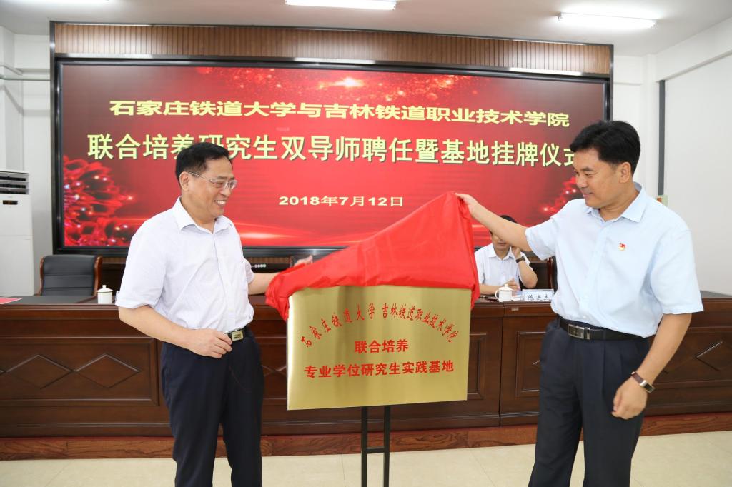 | 石家庄铁道大学王岳森书记与吉铁院王喜库书记为两校“联合培养专业学位研究生实践基地”揭牌 |