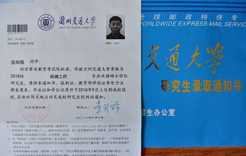 我院铁道车辆分院铁道车辆专业2015届毕业生张师旗,在2018年研究生考试中发挥优异,被兰州交通大学录取,攻读机械工程专业全日制硕士学位研究生。现特表祝贺,愿张师旗同学学业有成,再创佳绩!同时也希望铁道车辆分院学生以张师旗同学为榜样,努力学习,发掘潜能,奋发上进,收获自己的多彩人生。