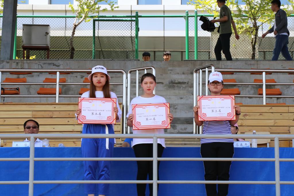 第七届田径运动会学生二年级女子团体总分前三名领奖
