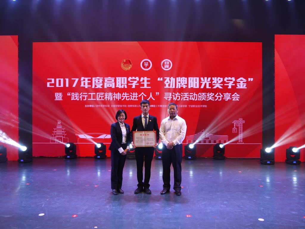 4月19日,2017年度高职学生“劲牌阳光奖学金”暨“践行工匠精神先进个人”寻访活动颁奖分享会在宁波职业技术学院举行。我院铁道信号分院赵利斌同学获得国家级特别奖荣誉称号。本活动由团中央学校部、全国学联秘书处、劲牌有限公司联合开展,共评选出10名特别奖获得者和300名优秀奖获得者。学院党委副书记徐彤宝、学院团委书记于威、团委干事陈思与铁道信号分院赵利斌同学一同参加了本次活动。