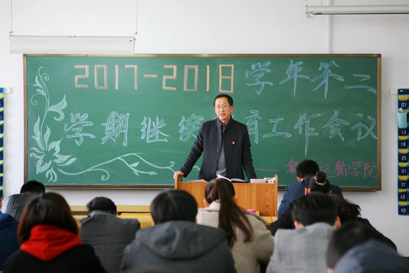 为贯彻落实学院继续教育工作会议和李欣副院长讲话精神,铁道运输分院于4月12日,在教学楼915室召开2017-2018学年第二学期继续教育工作会议。分院党总支书记盛继前、院长于伯良、副院长吴荣波、办公室主任刘士局、学办主任孟家辉、团委书记黄乐乐以及全体继续教育助学班主任参加了会议,会议由学办主任孟家辉主持。
