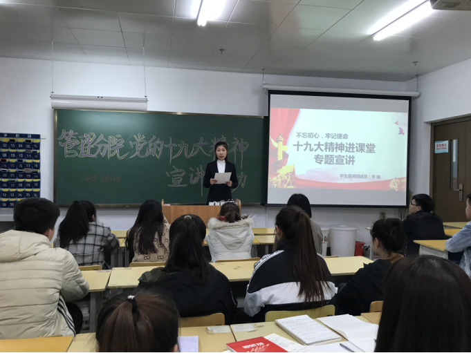 为进一步加深对党的十九大精神的全面认识和准确理解,让同学们真正学深、悟透党的十九大精神。3月22日,管理分院开展党的十九大精神宣讲活动,学院党的十九大精神辅导员宣讲队成员管理分院辅导员杨霄老师和学生骨干宣讲队成员李楠同学分别进行专题报告,管理分院2016级、2017级全体同学参加了本次报告会。