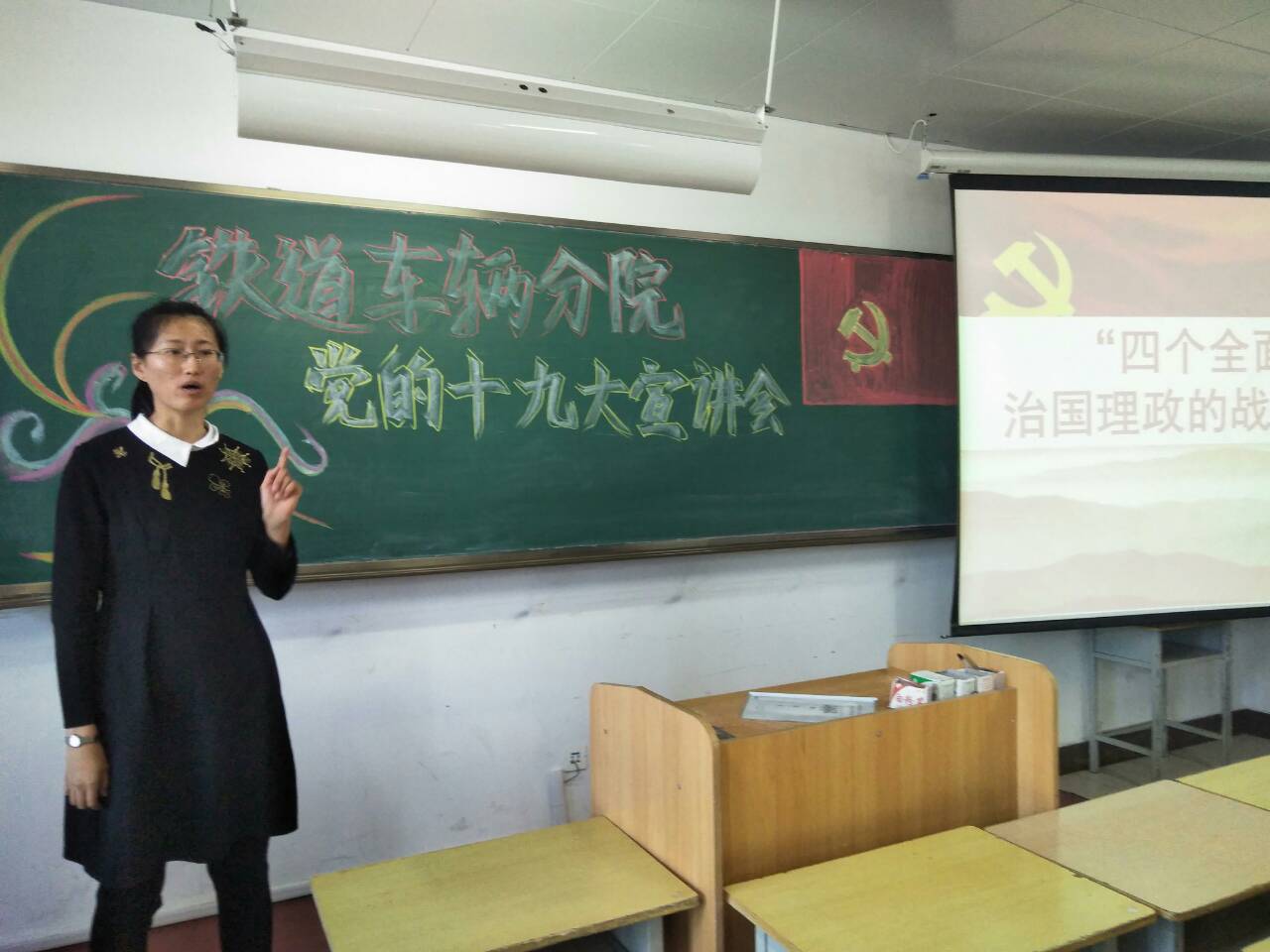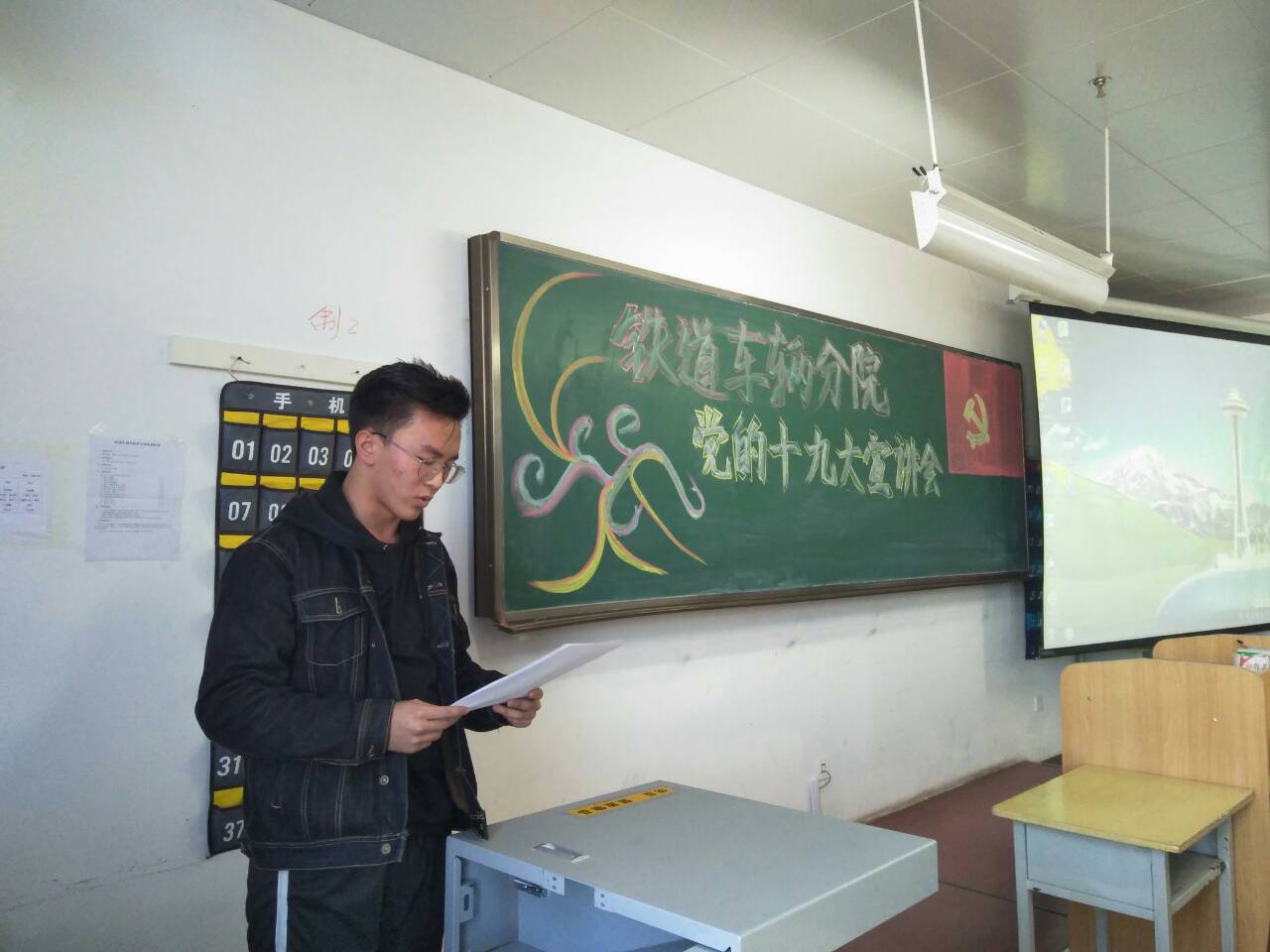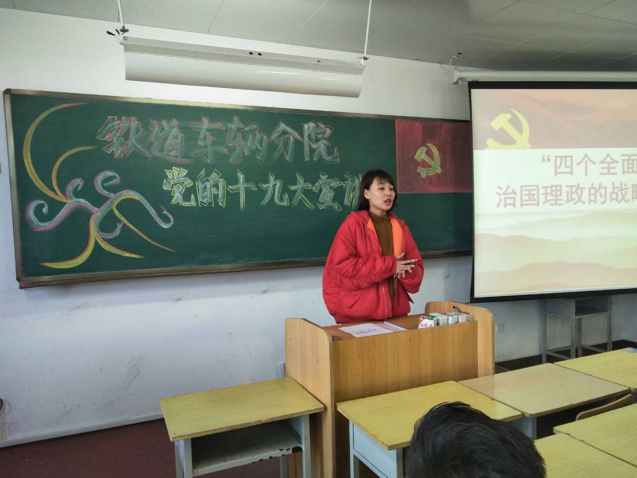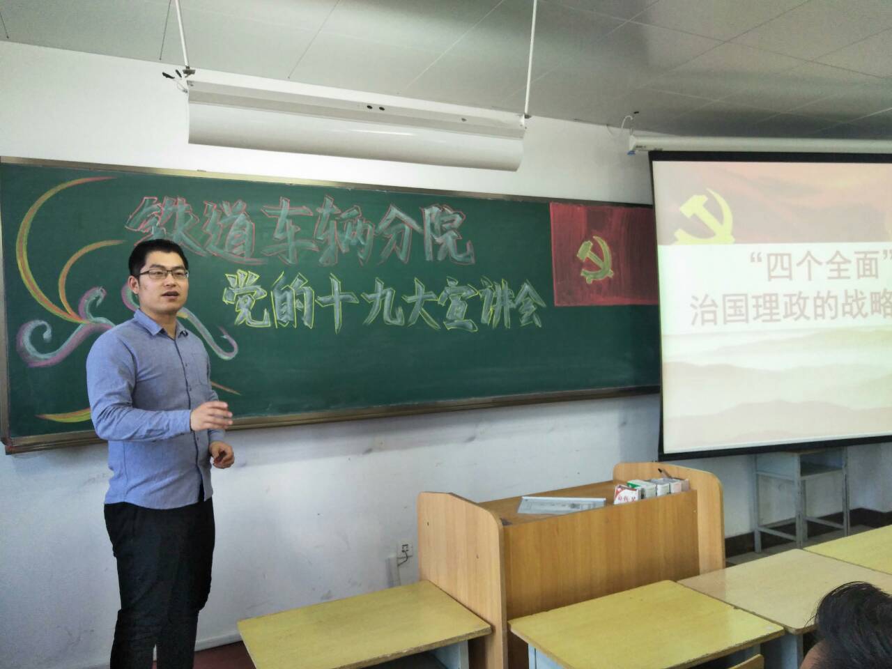为深入学习贯彻党的十九大精神,深刻理解和把握习近平新时代中国特色社会主义思想,按照学院党委要求,铁道车辆分院扎实推进开展了党的十九大精神宣讲活动。3月20日,铁道车辆分院在教学楼415教室举办了党的十九大精神宣讲活动,宣讲人有辅导员张琦、郭迪和分团委副书记李岚博同学。分院全体学生干部参加了宣讲会。宣讲活动由分院团委书记孙旭主持。