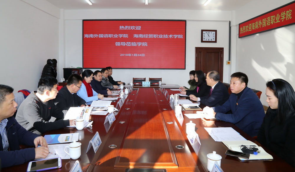 2018年1月24日上午,在海南外国语职业学院院长李渝凤、海南经贸职业技术学院党委副书记崔昌华的带领下,两院共计9名领导干部来到我院调研。学院党委书记王喜库、院长曹炳志、副院长李欣及来自相应部门的5名中层干部热情接待了调研团的各位领导。