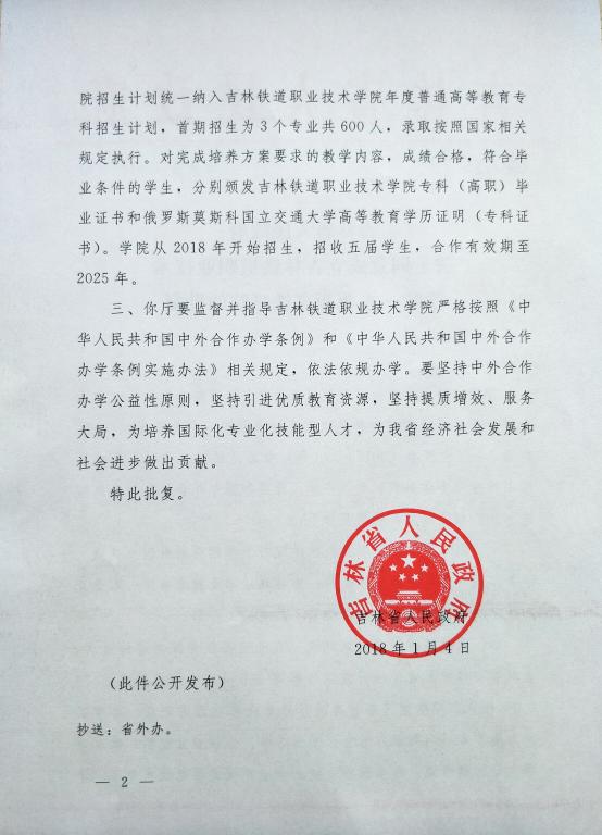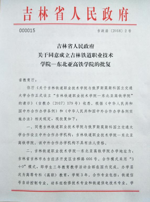 吉铁院中外合作办学机构——东北亚高铁学院,在全院上下共同努力下,在省教育厅的大力支持下,在省政府的亲切关怀下,于2018年1月4日获得吉林省人民政府批复。