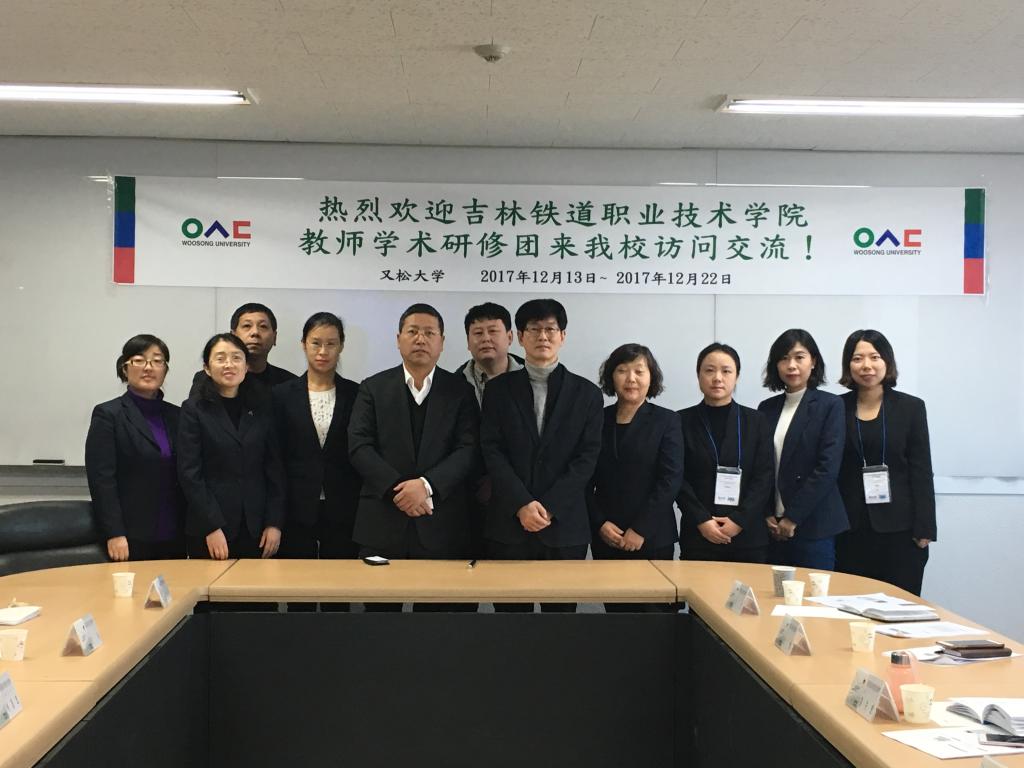 应韩国又松大学的邀请,学院党委副书记徐彤宝,铁道运输分院谢立宏老师、城市轨道交通分院刘秀丹老师、铁道信号分院刘烨老师、铁道车辆分院滕莉娜老师、管理分院孙素老师、铁道机车分院金雪松老师、铁道工程分院杨哲老师、电气工程分院陈洪军老师和机械工程学院赵艳老师一行10人组成研修代表团,于12月13日至22日赴韩国又松大学进行为期10天的研修,韩国又松大学甘瑞瑗校长、铁道物流学院郑灿默院长、铁道机车系张大成教授、铁道公社张峰熙处长、元洪善博士、五松设施事务所所长池贤宇博士热情接待了我院研修团一行。