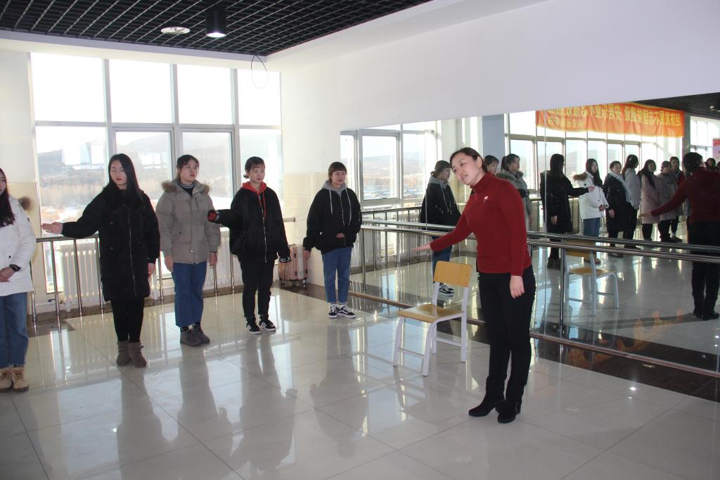 在专题实训环节中,吕秀慧副队长与范先云老师,利用9楼中厅形体训练设备,对学生们进行了站姿、行姿等培训。