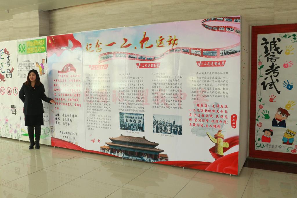 为纪念“一二·九运动”82周年,引导当代大学生学习历史、弘扬爱国主义传统,培养青年学生的历史责任感、使命感,坚定实现中华民族伟大复兴中国梦的理想信念,同时,深入落实共青团中央关于学习贯彻落实党的十九大精神的相关要求,12月18日,学院团委组织开展了“纪念一二•九,致敬新时代”主题宣传展板评比活动。活动由学院党委宣传统战部、学生工作处、学院团委负责人以及各分院党总支书记和数字媒体艺术设计专业教师担任评委。