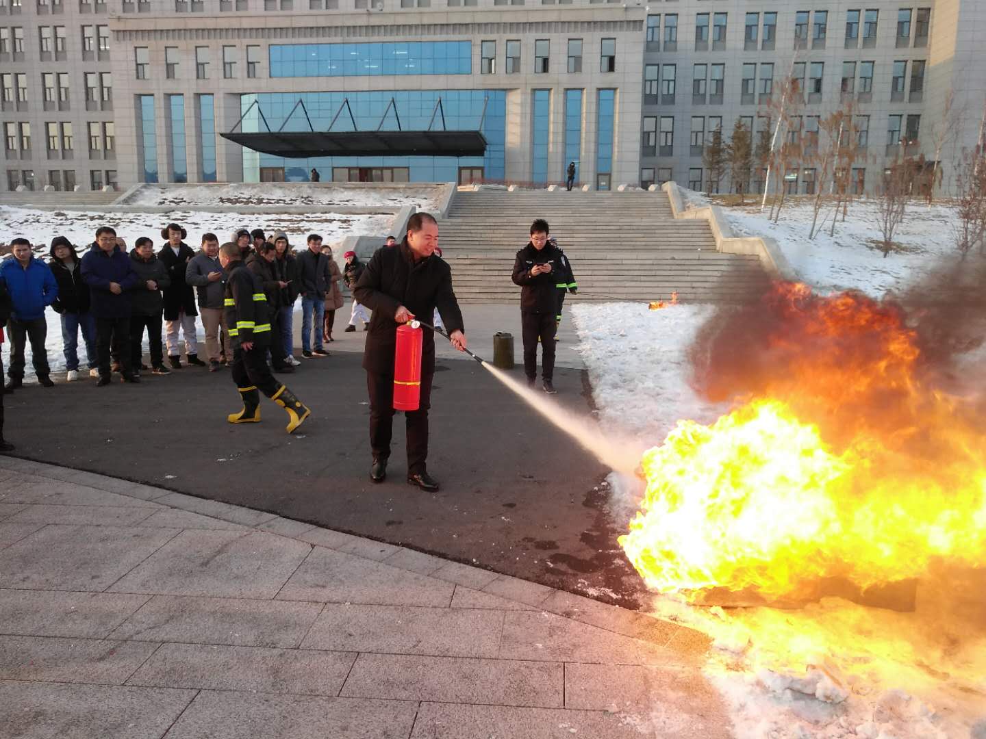 在教学楼文化广场对各微型消防站站长、副站长、骨干成员共50余人进行了消防技能实战培训演练,本次培训得到了学院领导的高度重视,学院院长曹炳志、副院长李欣亲临现场指导,并带头进行了灭火实操演练,各消防站成员积极配合,主动参与。