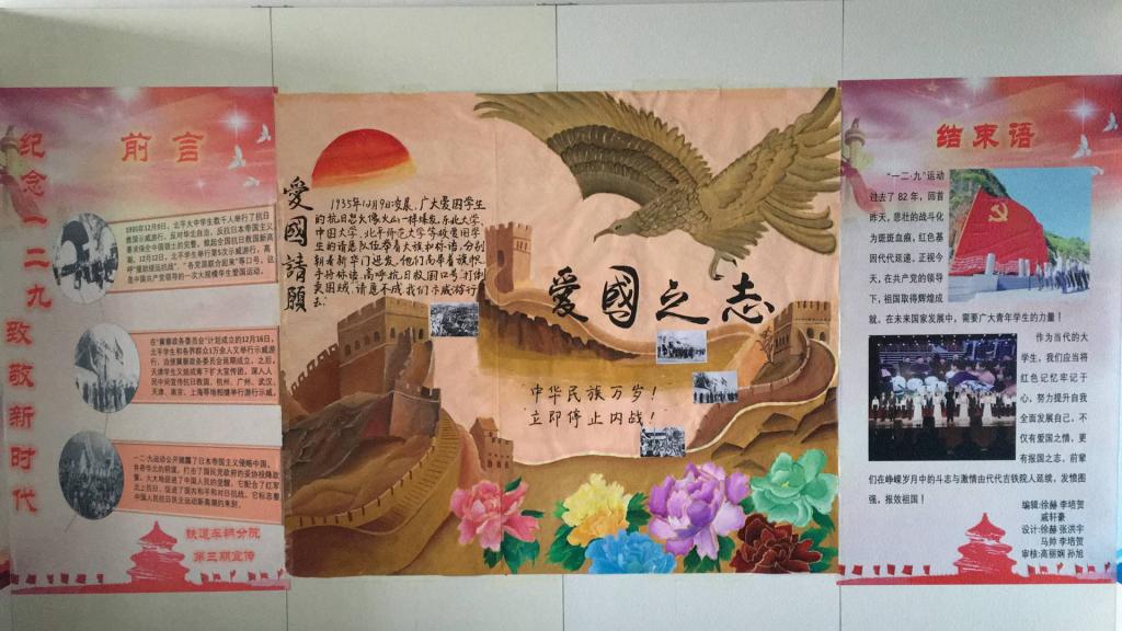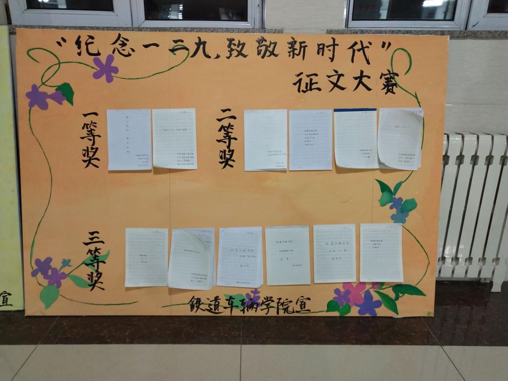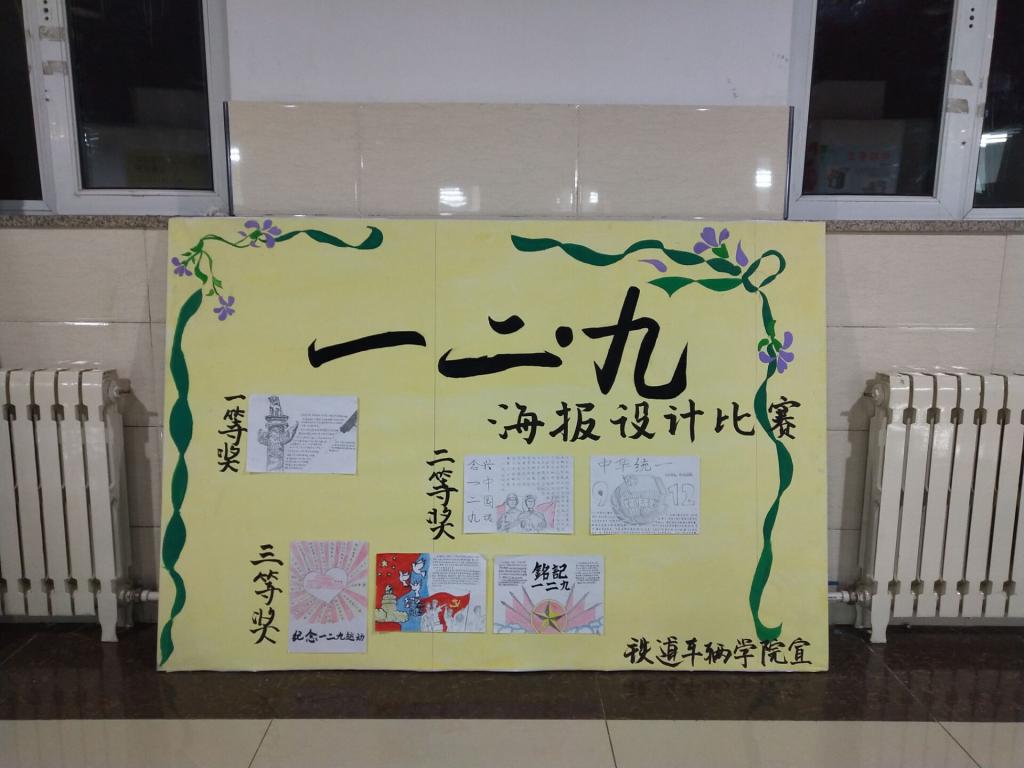 11月20日,铁道车辆分院发起了弘扬“一二·九”主题板报设计征集大赛,对海选上来的板报进行评比、筛选、展览。经过评选,车辆1706班设计的板报作品荣获一等奖;动检1702班和动检1705班设计的板报作品荣获二等奖;车辆1703班、车辆1704班和动检1701班设计的板报作品荣获三等奖。