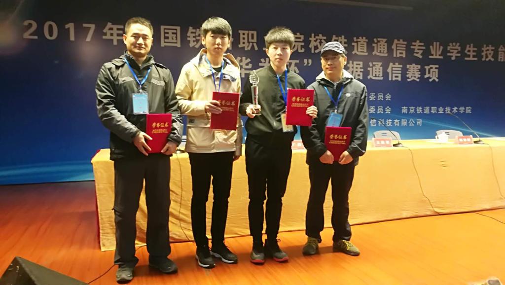 本届竞赛主要内容是网络设备的搭建与调试、数据通信故障排查与处理。比赛用华为设备搭建比赛平台,采用全球标准的数据通信协议OSPS、BGP、ISIS、VPN、MSTP、路由策略等作为考试内容,涉及了通信领域的前沿技术。竞赛过程中,施炳旭、王浩翰两位同学全心投入、程序顺畅、技术娴熟,顺利实现了两个环节中的“全网通”,得到了现场专家的认可,获得一等奖。指导老师王爱华、郐洪杰获得“优秀指导教师”称号。