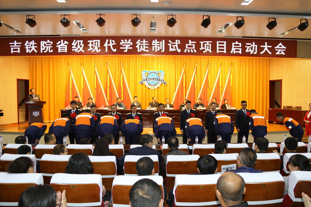 启动大会共十一项议程。学院教务处处长张辉宣读了《吉林省教育厅关于公布2016年度职业教育现代学徒制试点单位的通知》。吉林省教育厅职业与成人教育处处长宋春辉、合作企业代表沈阳铁路局吉林供电段钱平慎副段长分别做了讲话。随后我院曹炳志院长做了题为《把握质量核心突出双元主体 扎实推进学院现代学徒制试点工作顺利开展》的讲话。校企合作处处长王建军宣读了合作企业和聘任指导师傅的相关文件。学院领导为指导师傅颁发了聘书。在隆重的拜师仪式后,学院曹炳志院长与合作企业代表签订了现代学徒制框架合作协议,与学院试点专业负责人签署了责任状。合作企业指导师傅代表和学院试点专业代表进行了表态发言。