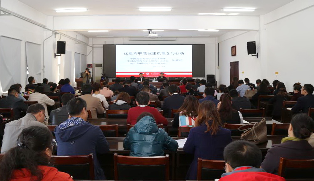 报告会上,周建松教授从优质高职院校建设是高职创新发展的重要内容、关于优质高职院校的认识与理解、对优质高职院校建设的思考与看法、优质高职院校建设必须抓住办学根本、优质高职院校建设必须突出专业建设、在优质高职院校建设中提升办学水平等6个方面,对《优质高职院校建设理念与行动》这个命题进行了全面的介绍和阐述。周建松教授特别指出,优质高职院校建设是《高等职业教育创新发展行动计划(2015-2018年)》的重要内容,这是继国家示范性高职院校建设计划后高职教育又一个综合性品质建设项目。周建松教授强调,优质高职院校建设的基本内涵和要求是:坚持以示范建设引领发展,鼓励支持地方建设一批办学定位准确,专业特色鲜明,社会服务能力强,综合办学水平领先,与地方经济社会发展需要契合度高,行业优势突出的优质专科高职院校,持续深化教育教学改革,大幅提升技术创新服务能力,实质性扩大国际交流合作,培养杰出技术技能人才,增强专业教师和毕业生在行业企业的影响力,提升学校对产业发展的貢献度,争创国际先进水平。