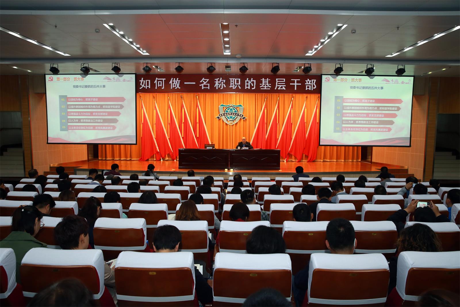 李洪明部长讲座的内容主要有四个方面:一是抓大事,即抓好班子建设、和谐校园建设、党支部建设、思想政治工作建设、党风廉政建设这五件大事。二是管方向,在决策监督、群众监督、党内监督下,保障党的路线方针政策、学校的规定和各项工作得到贯彻执行,且在预期范围内平稳有序开展。三是重协调,尤其是处理好学术权力和行政权利、群众组织和行政权力中间的关系。四是不越位,要有大局观念和宽广的胸怀,不争功、不抢活。在讲座的最后,李洪明部长结合个人在工作和生活中的体会,谈了要想做好基层党组织书记工作,就要善于把人做好,善于把握大局、抓住工作重点、做好工作计划;就要做事讲程序,不忽略小细节;就要做事有激情,生活有梦想,工作有家的观念;就要学会终身教育,用好心情去面对每一天的工作。
