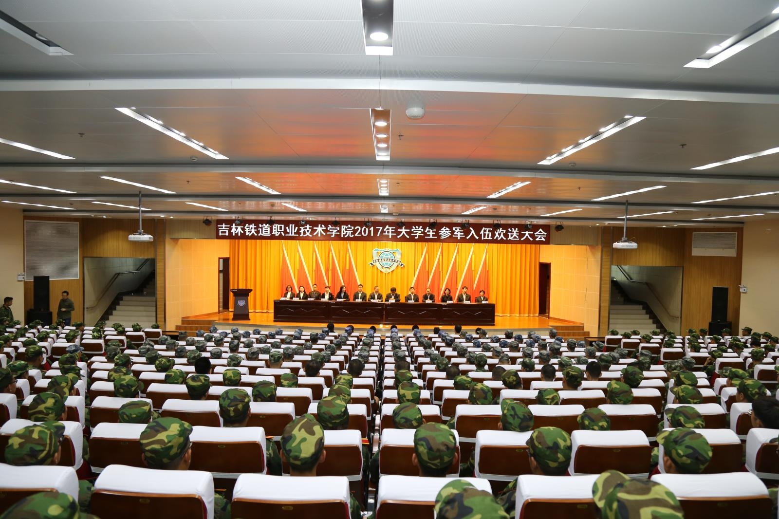 9月12日,学院在图书馆报告厅举行大学生应征入伍欢送会,学院党委副书记徐彤宝、学生工作处处长刘树全、学院团委书记于威以及各分院党总支书记、学办主任、团委书记、一年级辅导员、127名参军同学及部分新生代表共480余人参加了欢送会。会议由刘树全处长主持。