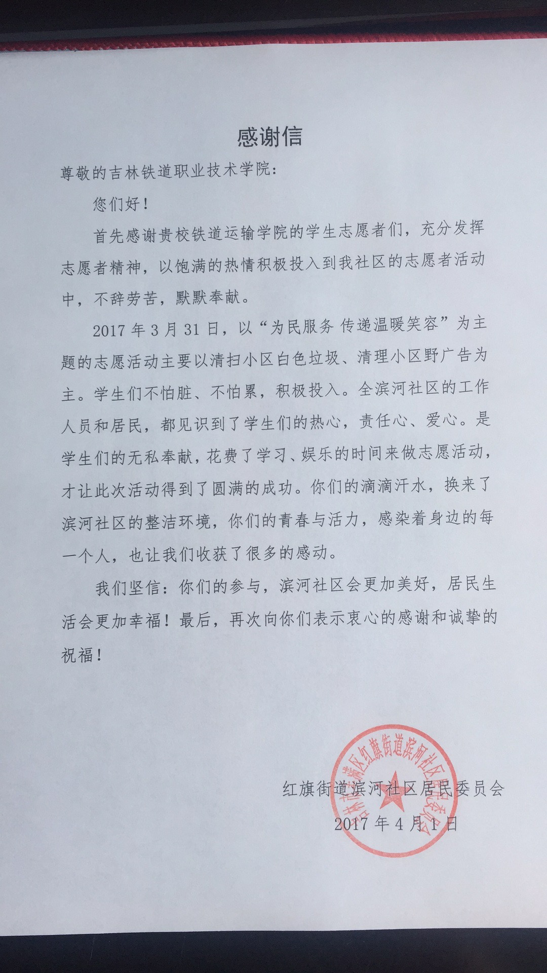 为传承雷锋精神,推进人文素质培养,以雷锋精神为标尺、以善行义举为准则,争当时代楷模,根据学院团委要求,铁道运输分院于3月31日下午组织了进社区“为民服务·传递爱心”志愿服务活动。