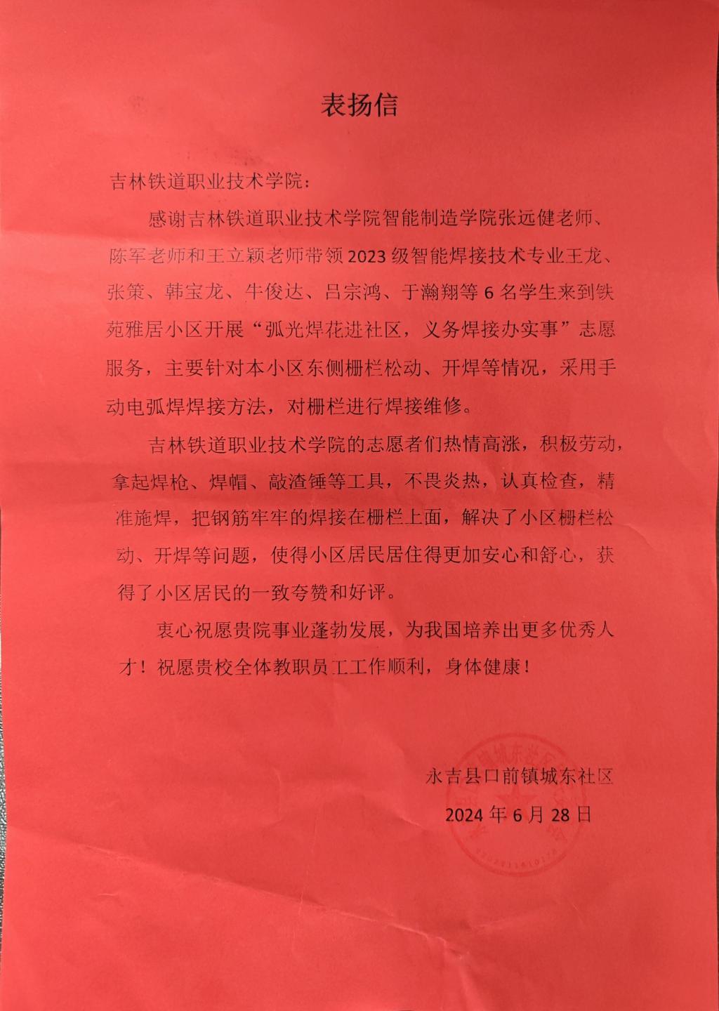 此次活动有效维护了小区的安全,得到了小区业主们的一致夸赞和好评,更展现出了吉铁院学生铁一般的本领和精益求精的工匠精神。未来,智能制造学院将继续以党旗为引领,以技能强国为目标,在实践中提高技能本领,以服务师生最根本、最普遍、最迫切的需求为出发点和落脚点,在志愿服务中彰显吉铁院学生的青春和力量!