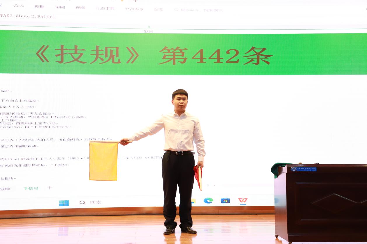 本次竞赛采取规章背诵与实操演示结合的方式,竞赛试题选自《铁路技术管理规程》2014版(2023年修订),背规部分每名选手进行现场随机抽签,抽取规章进行背诵;实操部分每位评委随机抽取昼(夜)间手信号进行动作演示考查,按最终成绩排名。