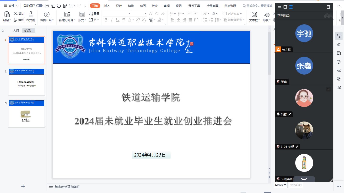 为进一步贯彻落实学校就业工作攻坚大会部署要求,引导我院毕业生明确当前就业形势,摆正就业定位,抓牢就业黄金季契机,4月25日,铁道运输学院面向所有2024届未就业毕业生召开了“就业推进线上攻坚会”。学院党总支书记张鑫、院长吴荣波、党总支副书记高露、2024届毕业年级辅导员马宇驰及全体未就业毕业生参加会议,会议由马宇驰主持。部分学生因自主实习、请假等原因不在校,因此本次会议采取线上形式。