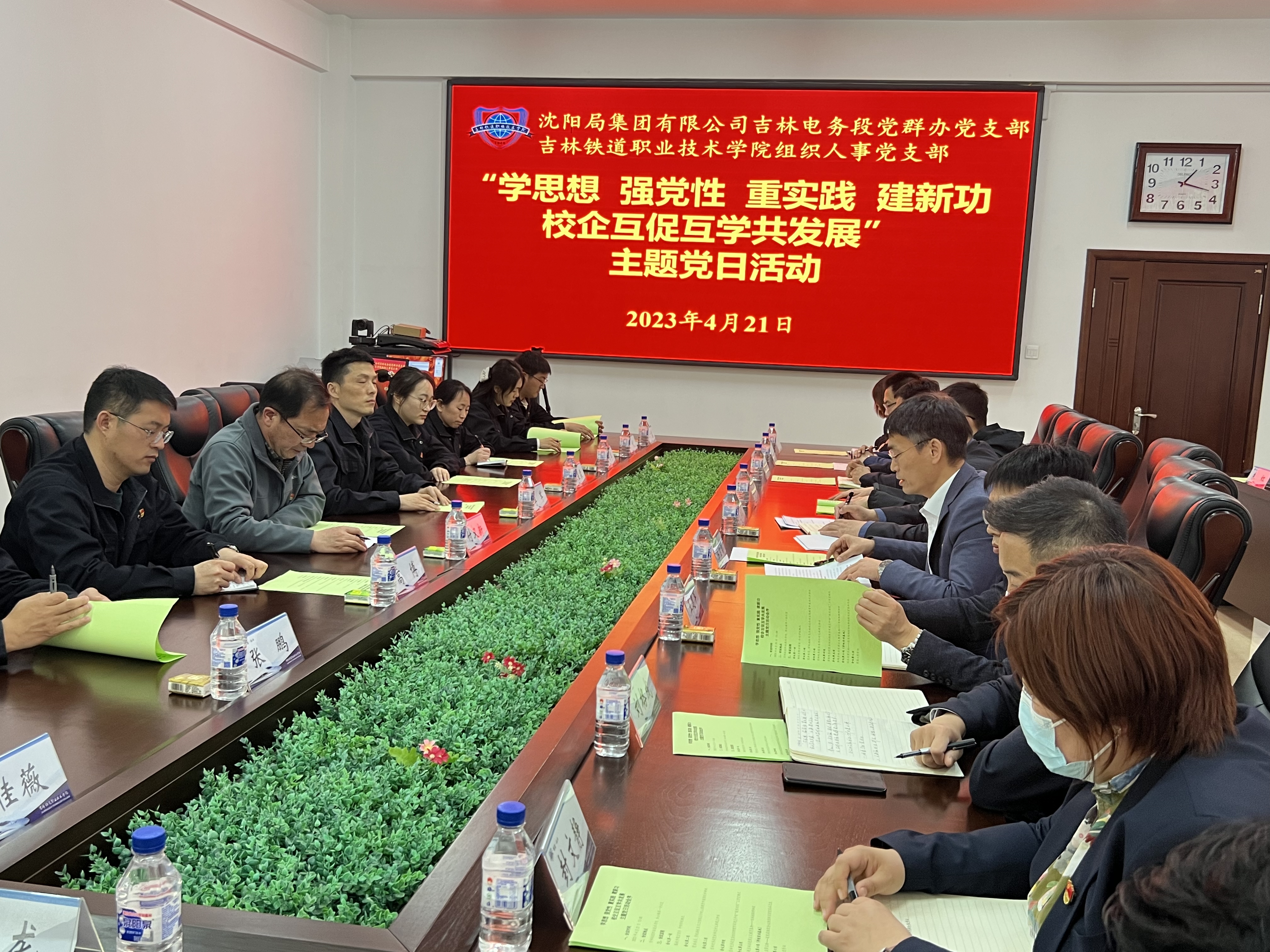 为深入开展学习贯彻习近平新时代中国特色社会主义思想主题教育工作,筑牢“一切工作到支部”的鲜明导向,推进“国家级、省级样板支部”“星级优秀党支部”创建活动,深化校企合作,相互学习党建工作先进经验和典型做法,2023年4月21日下午,学校组织人事党支部与沈阳铁路局集团公司吉林电务段党群办党支部开展“学思想 强党性 重实践 建新功 校企互促互学共发展”主题党日活动。
