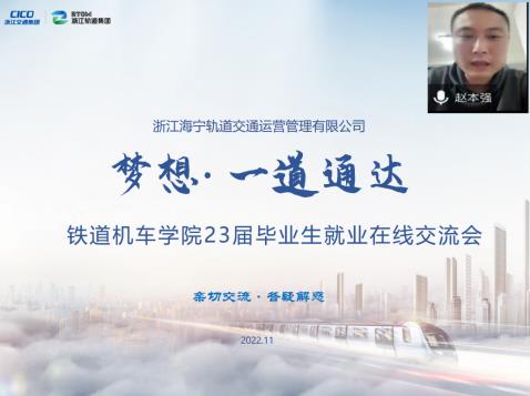 铁道机车学院于2022年11月9日召开2023届毕业生就业线上交流会。浙江海宁轨道交通公司乘务中心电客车司机赵本强作为本次座谈会的特邀嘉宾,与同学们进行深入交流。会议由铁道机车学院辅导员孔亮主持,学院党总支书记关洪亮、副书记王蒙与2023届毕业生参会。