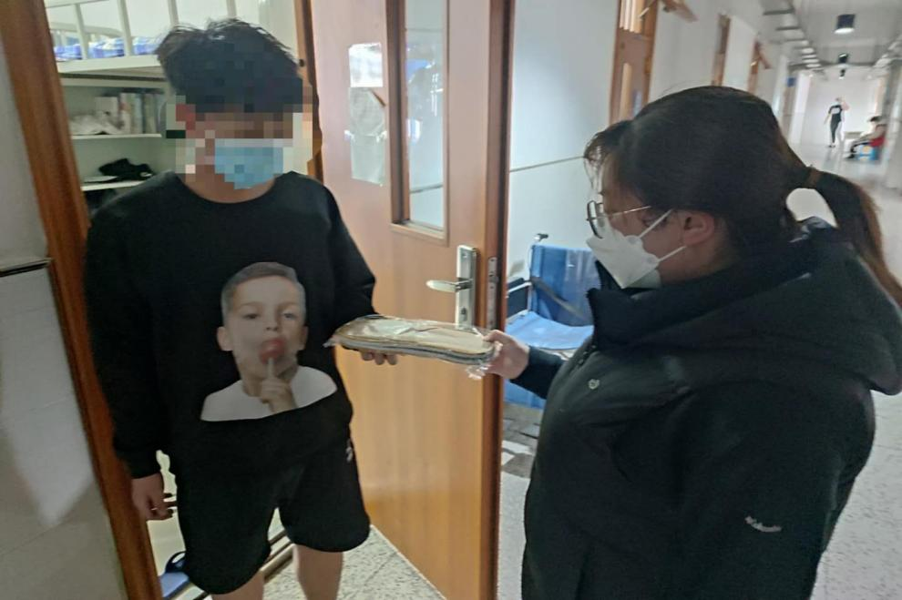为及时帮助患病同学减轻不适,董文卓、王佳和驻校教务处董娜老师自发的将个人每日餐食中的酸奶、鸡蛋等食品送给相关同学,为他们带去了实实在在的帮助和温暖。