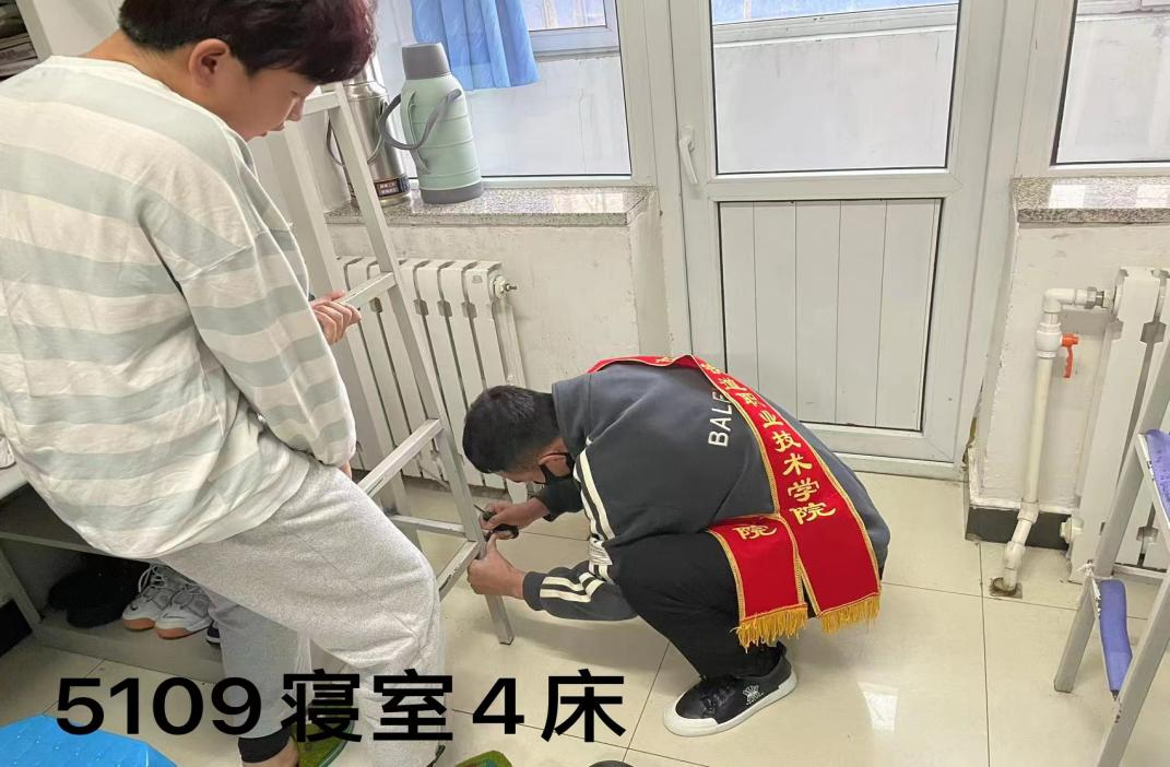 会后,由学生党员和积极分子组成的志愿服务突击队开展了公寓自修活动。为减轻大学生公寓管理中心的维修负担,志愿服务突击队对5号学生公寓楼8个寝室14张床的床梯进行了加固维修。指挥部提供了手持电钻、扳手、螺丝刀等工具和各型号螺栓。
