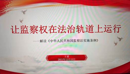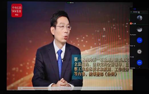 12月15日晚,学院组织开展了学习《中华人民共和国监察法实施条例》专题党课,通过线上会议的形式进行,由纪检委员王蒙主持。会上,王蒙结合日前对《条例》的自学内容,以“让监察权在法治轨道上运行”为主题,介绍了《条例》的颁布背景和内容概况,随后,组织与会同志观看了中央纪委国家监委网站《在线访谈》栏目,由中央纪委国家监委法规室主任邹开红权威解读监察法实施条例,对《条例》的制定意义和主要内容进行了系统的介绍和解读。通过专家的讲解和分析,促进了学院全体教职工对《条例》内容的学习和领会。最后,王蒙强调,作为高校教师肩负着为党育人、为国育才的责任和使命,要严于律己、严以修身、严以用权,正确行使手中的公权力,扎实做好教书育人工作,远离红线、底线,自觉弘扬新时代师德师风精神。