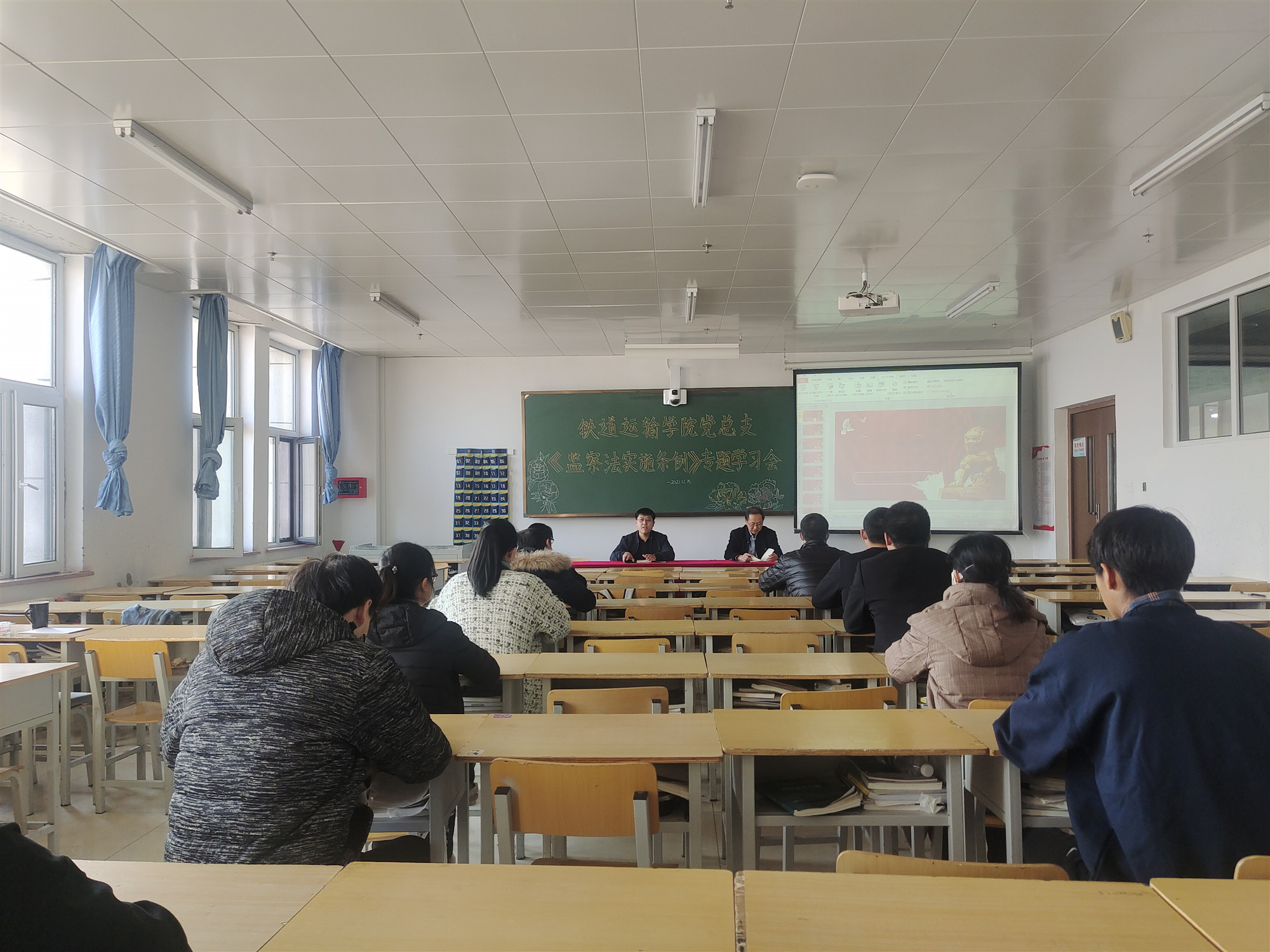12月15日,铁道运输学院党总支在教学楼917室开展贯彻落实学习《中华人民共和国监察法实施条例》专题学习会,党总支副书记韩阳主持会议,副科级以上干部参加会议。