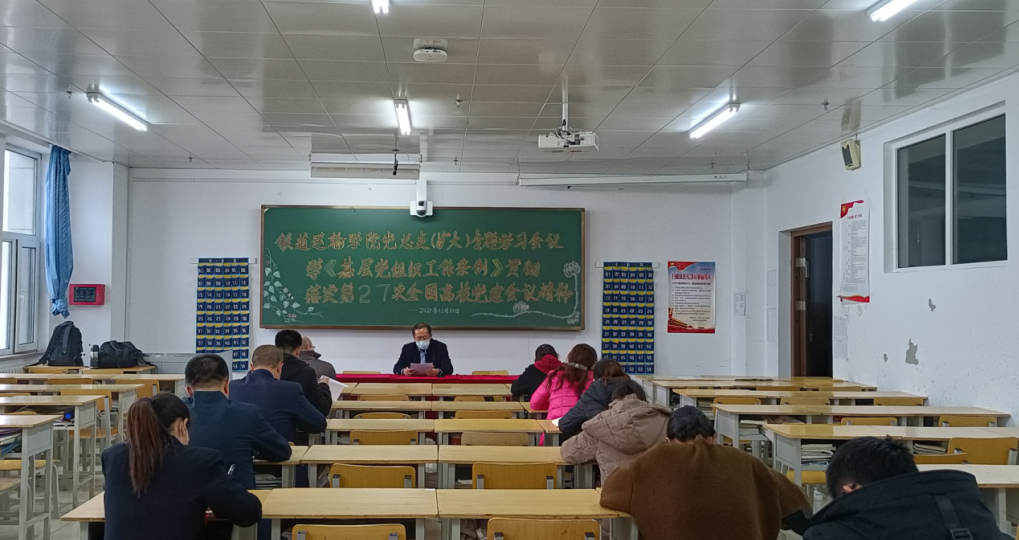 12月10日,铁道运输学院党总支在教学楼917召开贯彻落实《中国共产党普通高等学校基层组织工作条例》和第27次高校党建会议精神专题学习会,党总支书记张鑫主持会议,副科级以上干部、学工干部参会。