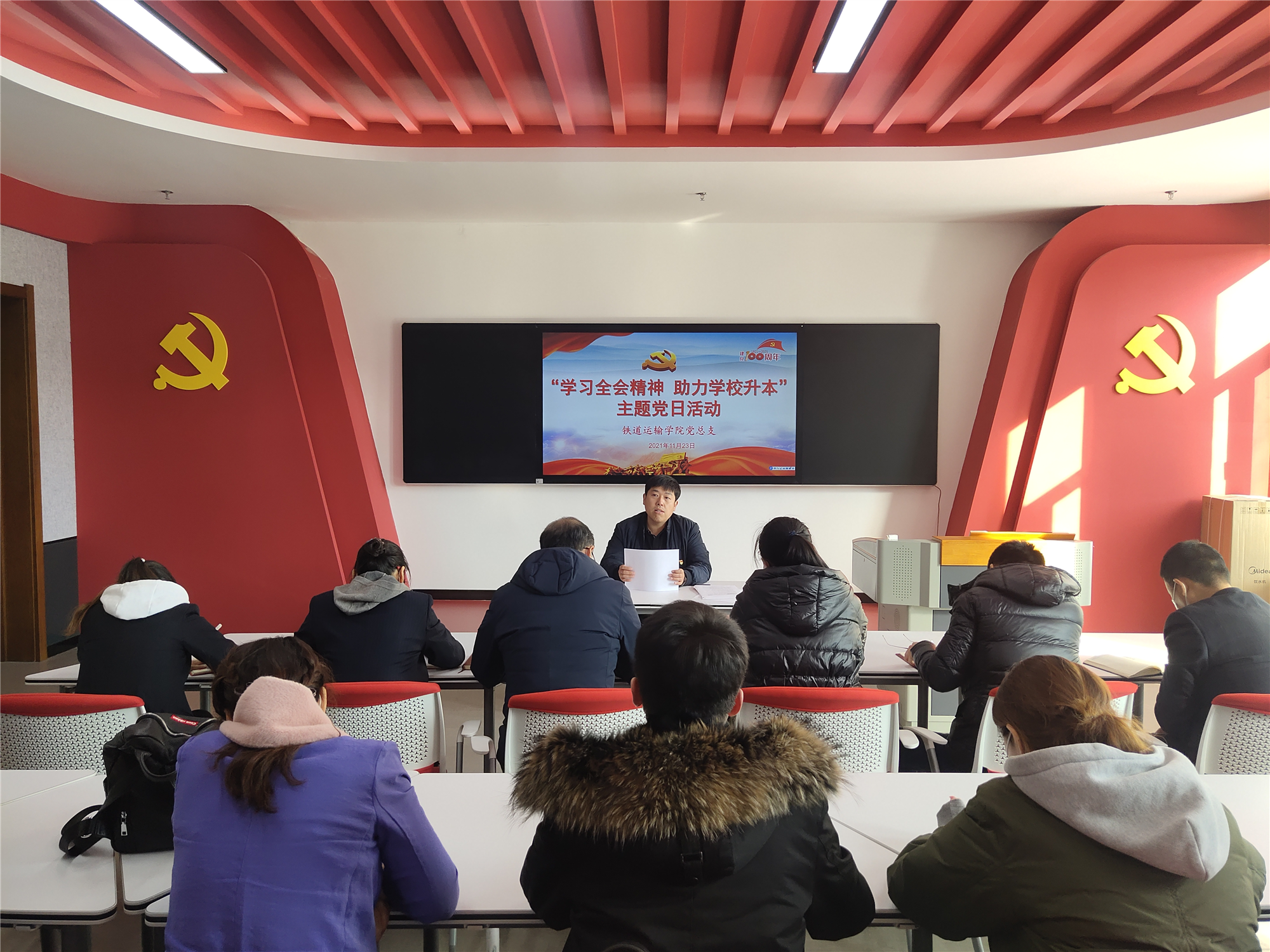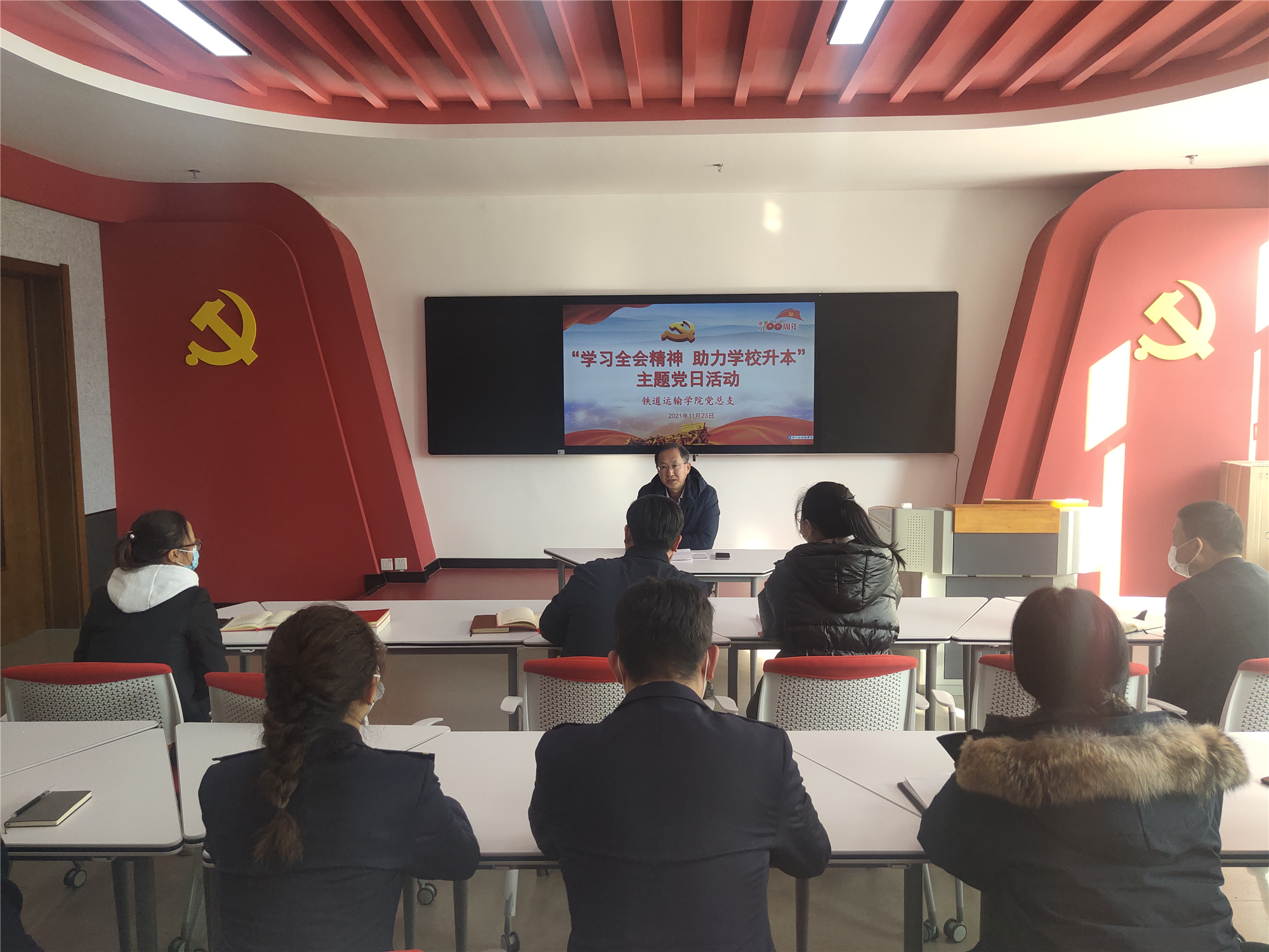 为学习宣传贯彻党的十九届六中全会精神和第27次全国高校党的建设工作会议精神,进一步助力学校升本工作顺利推进,11月23日,铁道运输学院党总支通过线上和线下结合的方式开展“学习全会精神 助力学校升本”主题党日活动,学院全体师生党员参会,会议由党总支副书记韩阳主持。