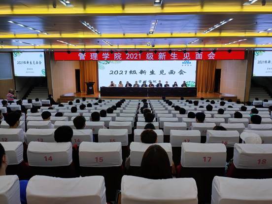 为落实2021级新生入校教育的工作要求,帮助学生快速适应校园生活,了解所学专业和就业方向,9月28日,管理学院2021级新生见面会在图书馆报告厅举行,参加会议的有管理学院党总支书记杨秀、院长周云凌、副院长郑学健、党总支副书记王蒙、各教研室主任、专任教师、各班主任以及2021级全体新生,会议由学生工作办公室主任高露主持。