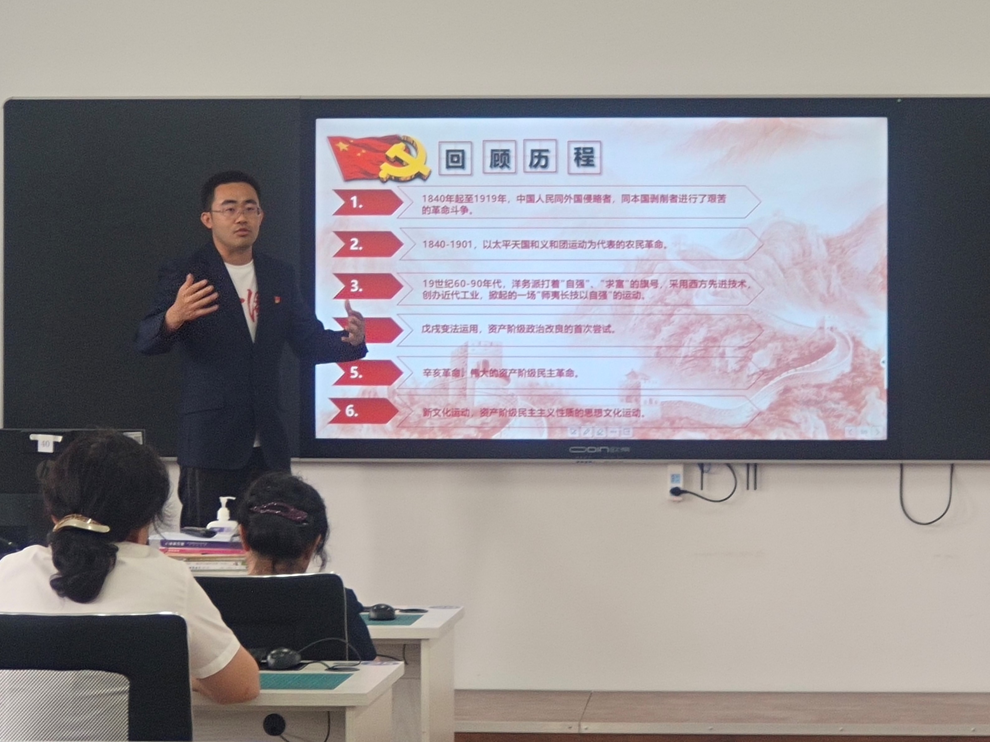 活动中,王蒙带领全体党员共同回顾党的光辉历程,深入浅出,生动形象,通过介绍中国近代史的重大历史事件勾勒出中国近代史发展框架,也梳理出了中国共产党的发展历程和历史脉络。随后,学生党支部的于沛弘、高露同志分别诵读了毛泽东《沁园春·长沙》、《沁园春·雪》,教工党支部温子玉和宋晓丹同志分别诵读了《纪念中国共产党成立100周年(组诗)》,学生党员和入党积极分子代表进行了小合唱《我的祖国》,唱响了新时代青年师生的爱国爱党情怀。最后,学院院长周云凌同志带领全体党员重温入党誓词,全体党员认真宣誓,再次重温誓词。
