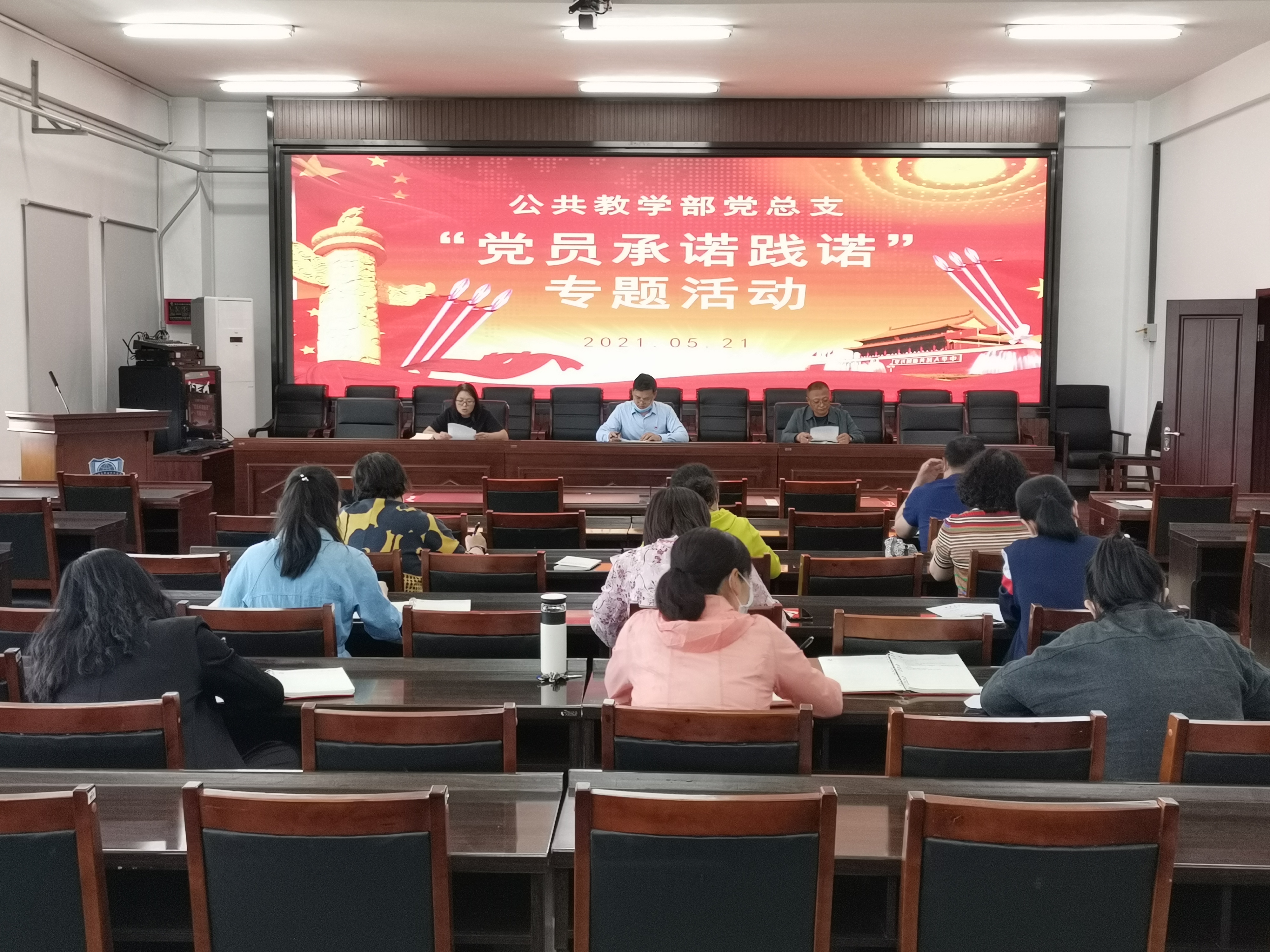 5月21日下午,公共教学部党总支在行政楼五楼会议室开展了“签署党员承诺践诺书”主题党日活动。活动由公共教学部党总支书记侯春奇主持,公共教学部全体党员参加了本次活动。