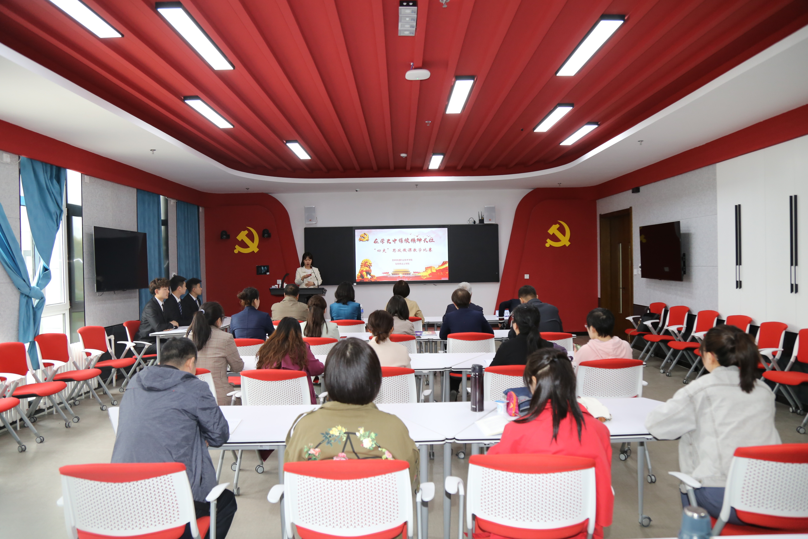 本次比赛由吉林农业科技学院中国近现代史纲要教研室邸艳英教授、吉林医药学院中国近现代史纲要教研室尹艳辉副教授、吉林工业职业技术学院退休教师杨宝田副教授、学校教务处长王学明教授和马克思主义学院院长李晓平教授担任评委。本次比赛旨在通过评比观摩,进一步深入贯彻习近平总书记在党史学习教育动员大会上的重要讲话精神和加强“四史”教育的重要讲话批示精神,切实发挥思政课铸魂育人主渠道作用,有效推动思政课改革创新。