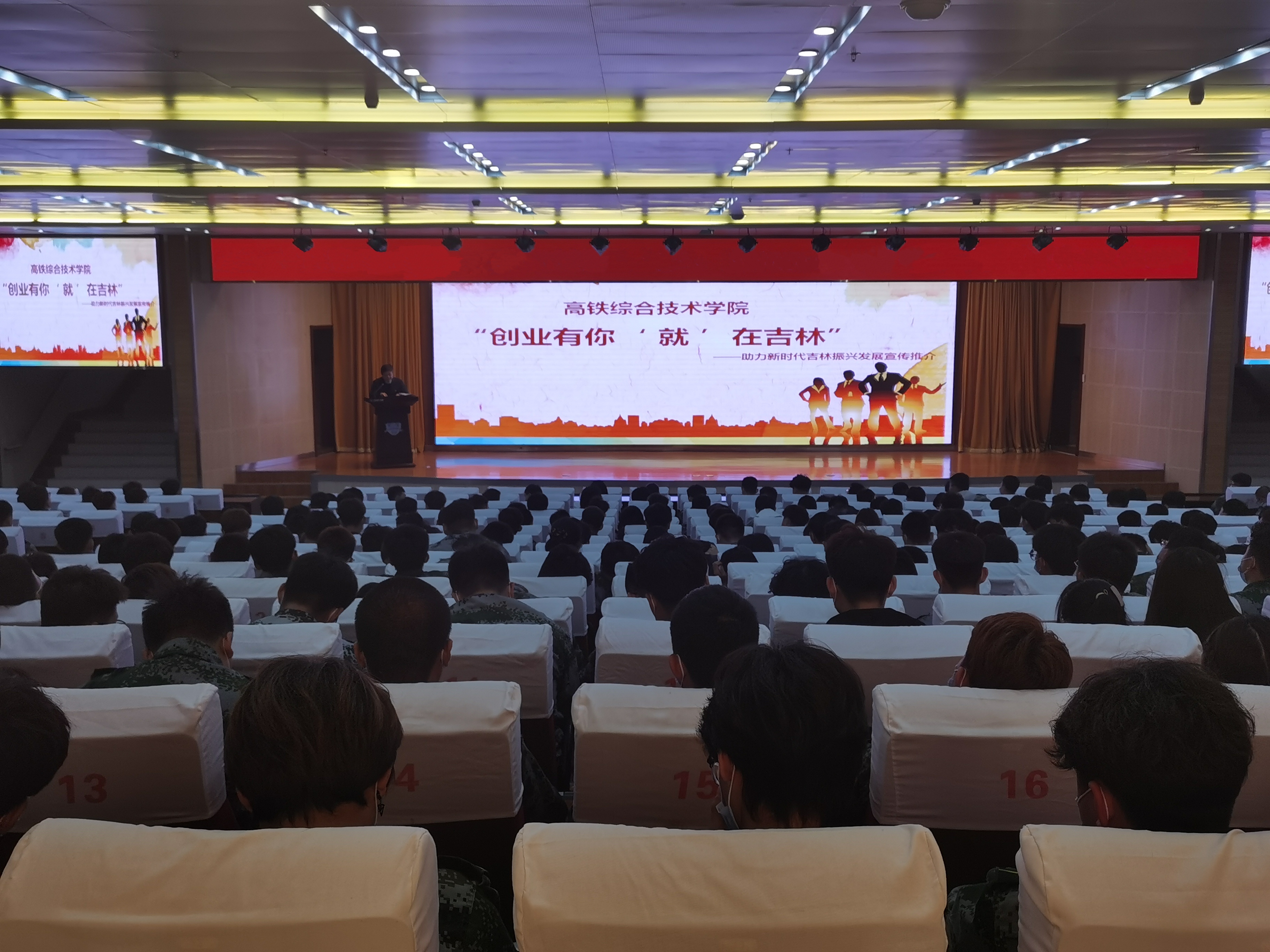 5月13日下午,高铁综合技术学院在图书馆报告厅举行“创业有你 ‘就’在吉林”宣传推介会,贯彻吉林省委、吉林市委开展“创业有你‘就’在吉林”集中宣传推介活动精神。党总支书记赵明传达了吉林省委书记景俊海、吉林市委书记贺志亮在“宣传推介”活动的讲话精神,向同学们转达了学校党委书记宋春辉在学校“共青团创先争优表彰暨新团员入团宣誓大会”上发出的毕业生留省就业的邀请。学院全体教师、毕业年级学生和其他年级代表480人参加了宣传推介会。