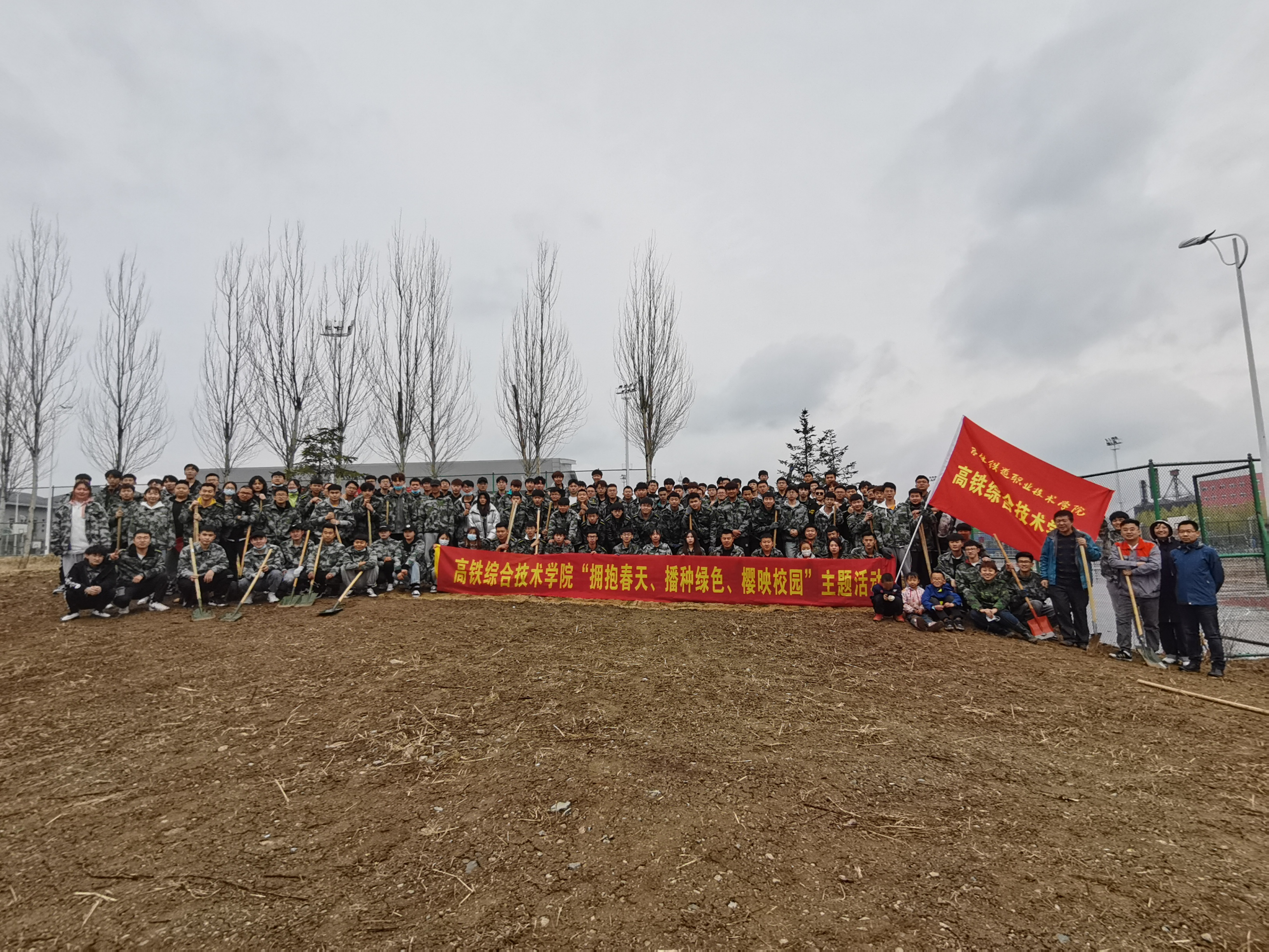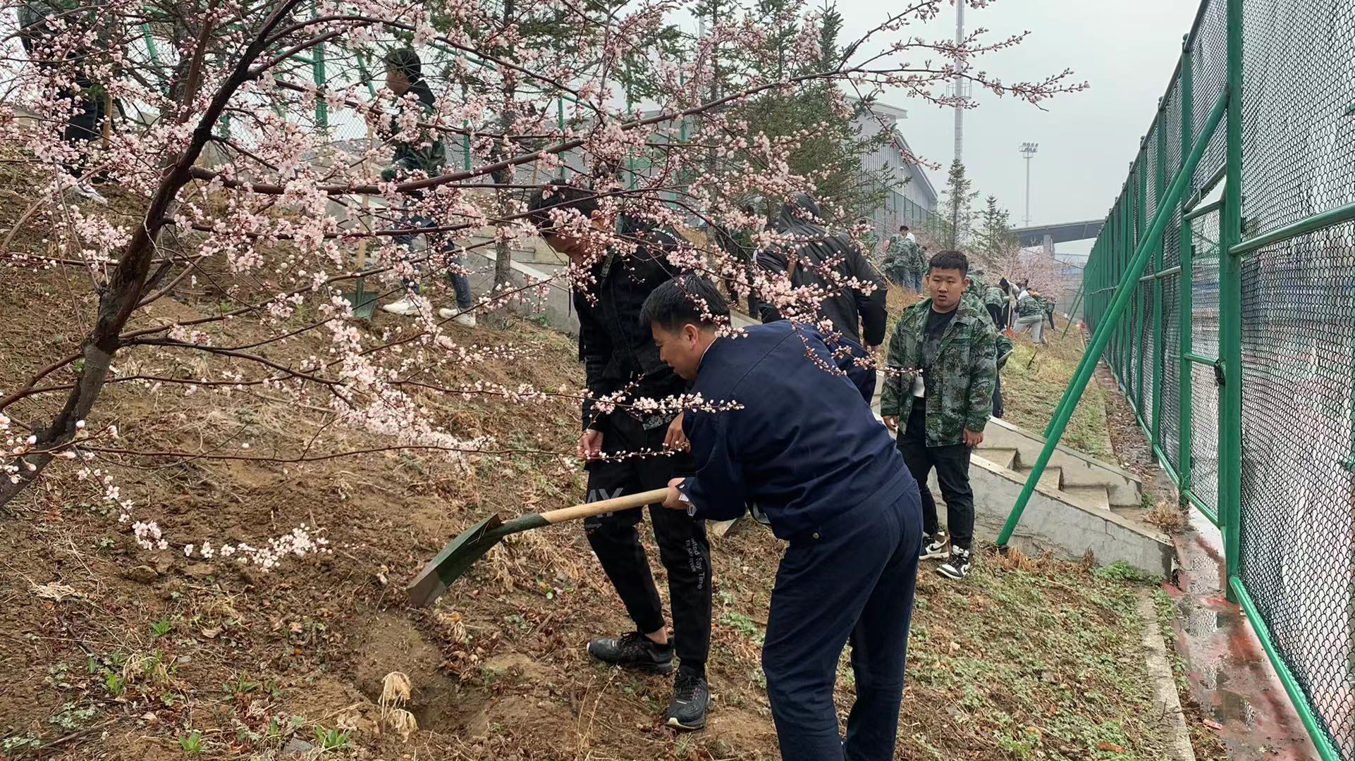 春风吹拂处、新绿绽枝头。当日春雨游丝,来自高铁综合技术学院的教师、学生党员及150多名志愿者冒雨如期掀起植树热潮。他们把即将开辟为建设工地上的近400棵樱桃树苗,移栽到校园东南侧网球场护坡上,形成面积达一亩的一片“樱桃园”。