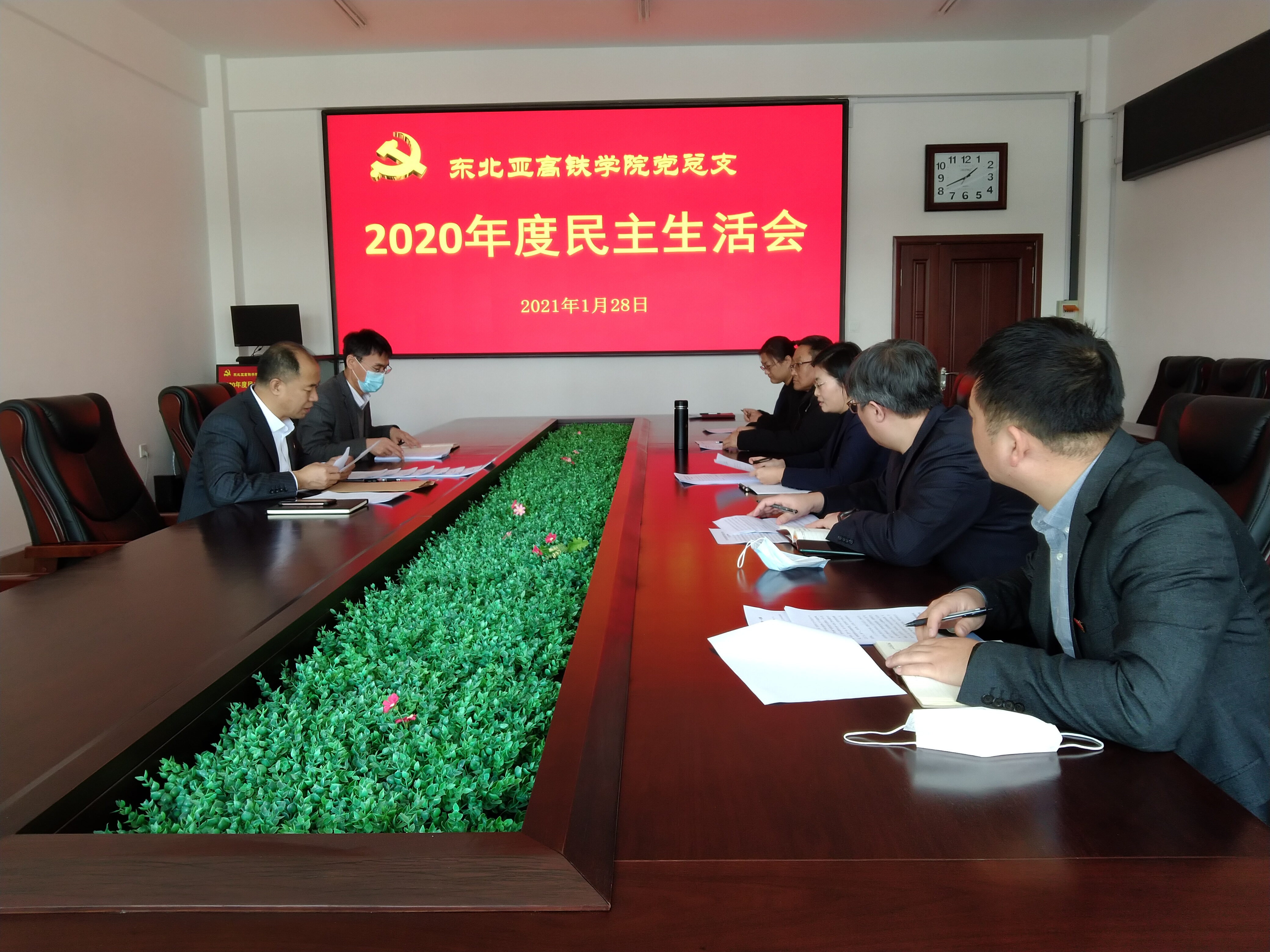 按照《吉林铁道职业技术学院2020 年度党员领导干部民主生活会方案》有关要求,东北亚高铁学院党总支于2021年1月28日在办公楼第一会议室召开2020年度民主生活会。学院党委高度重视,党委副书记、校长曹炳志,党委组织人事部部长马卫强亲自到会督导。参加此次民主生活会的人员为东北亚高铁学院党总支委员会委员、处级干部。会议由党总支副书记于威主持。