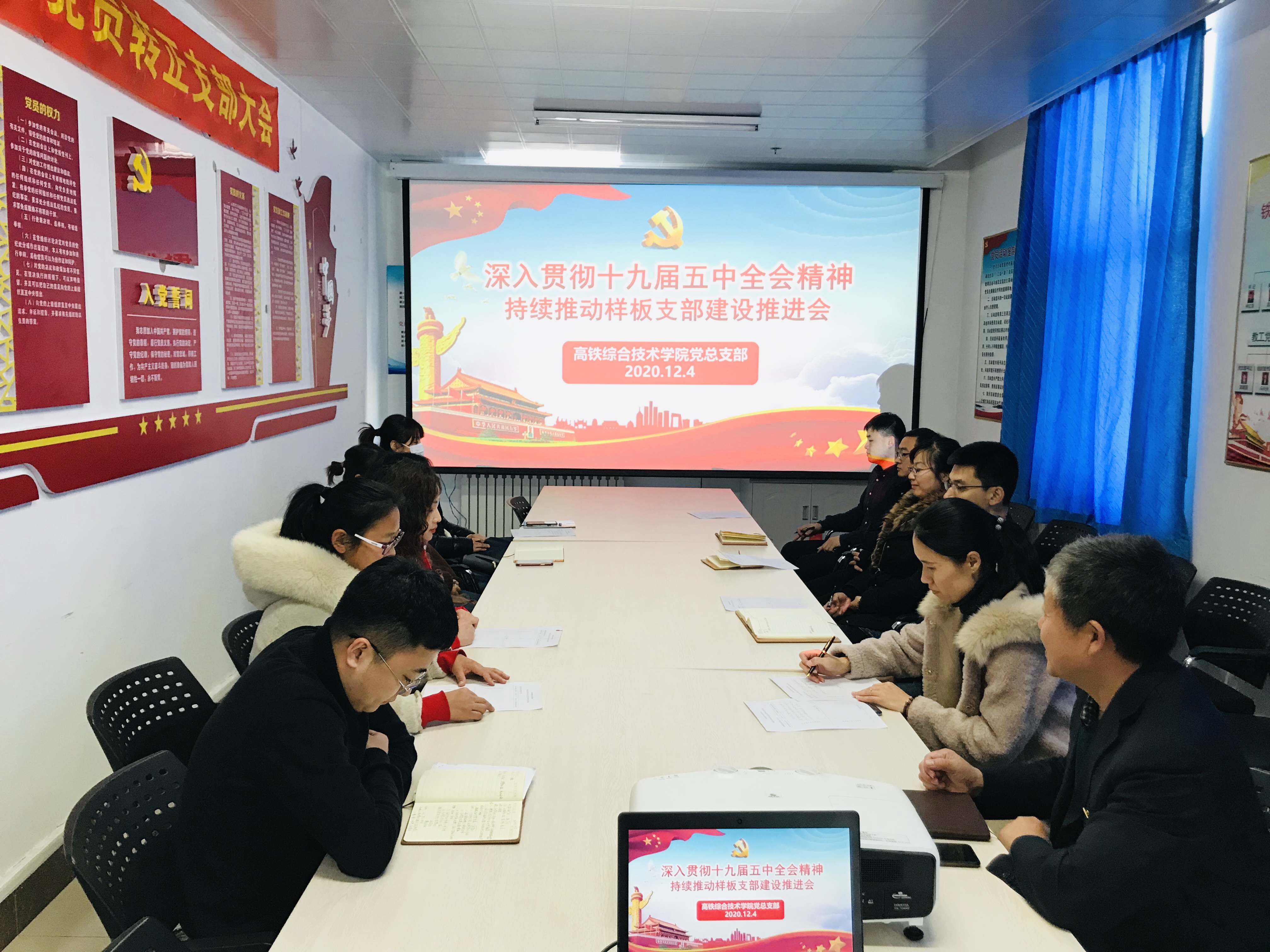 12月4日,高铁综合技术学院党总支召开党员大会,结合深入学习贯彻十九届五中全会精神,研究教工党支部全国首批新时代高校党建示范创建和质量创优工作验收和持续推动样板党支部创建工作,会议由党总支书记赵明主持。