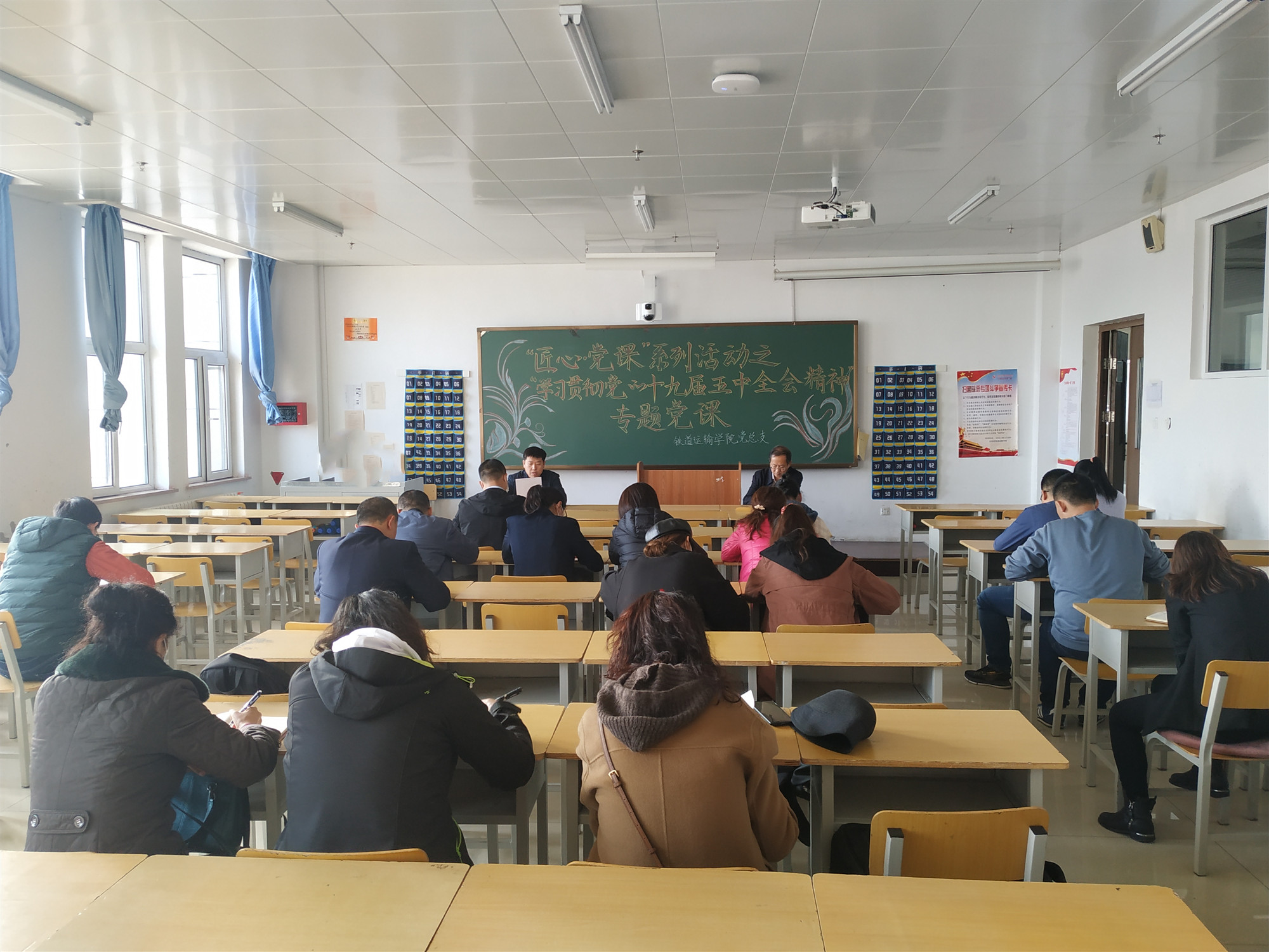 2020年11月10日中午,铁道运输学院党总支在教学楼917室开展“学习贯彻党的十九届五中全会精神”专题党课。学院全体党员参加,党总支书记张鑫主讲。