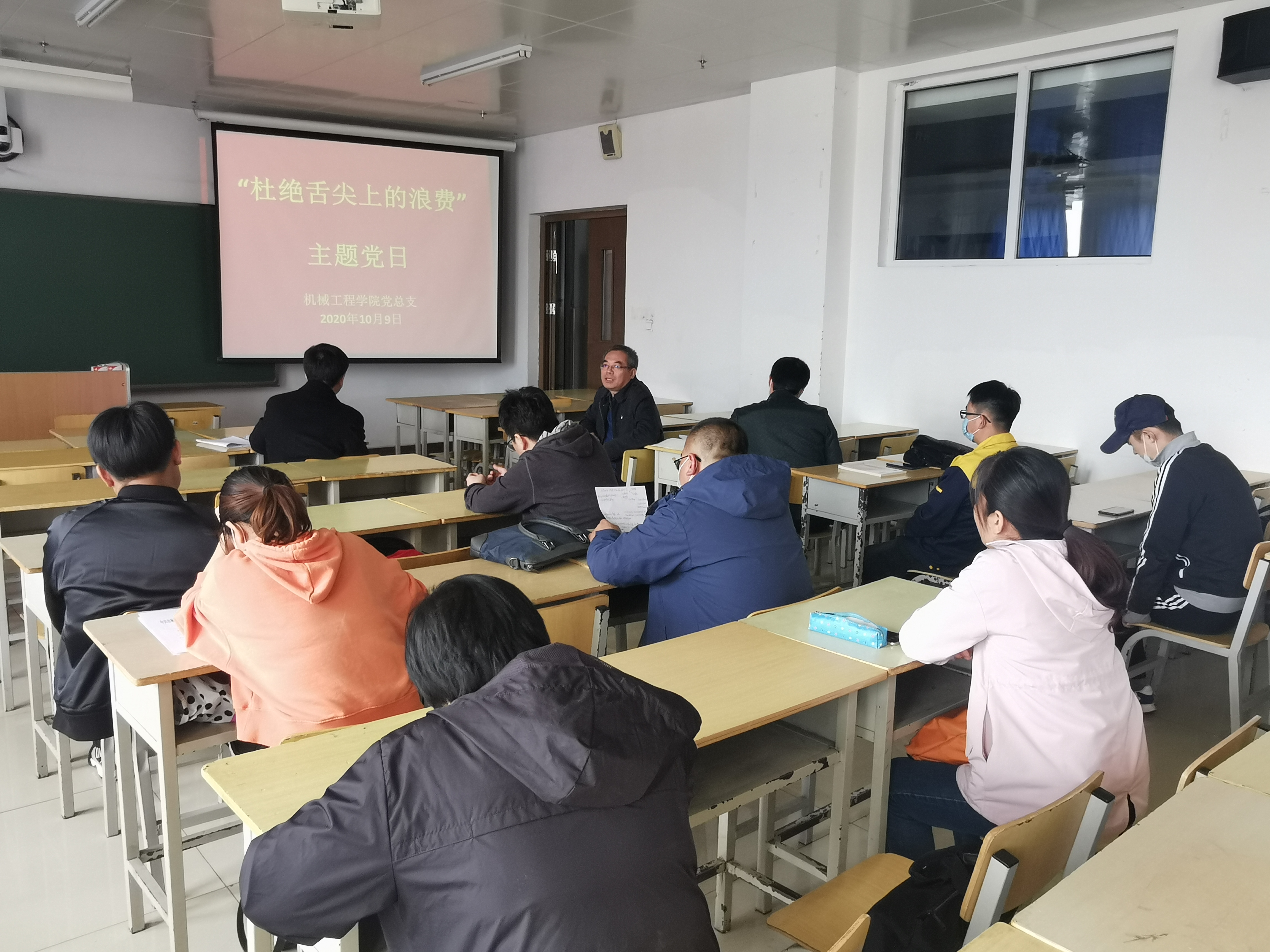 为了认真贯彻落实习近平总书记关于对制止餐饮浪费行为的重要指示精神,10月9日下午,机械工程学院党总支在教学楼709开展了“杜绝舌尖上的浪费”主题党日活动。学院全体党员参加了本次党日活动,活动由组织员王冲主持。