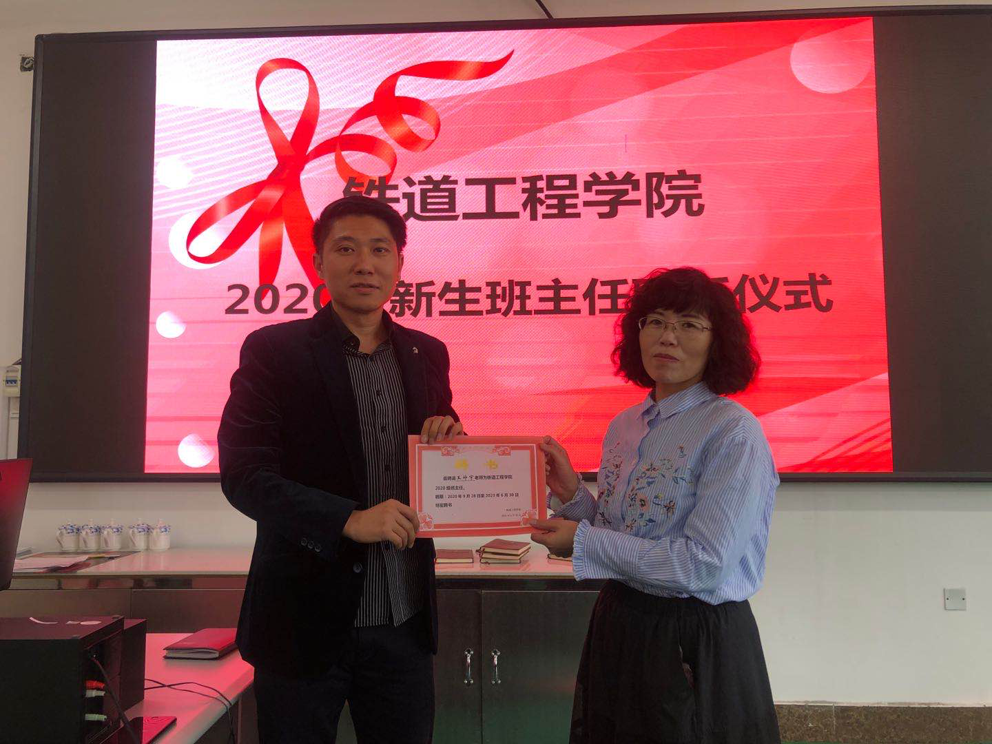 | 副院长李东侠为新生班主任发放聘书 |